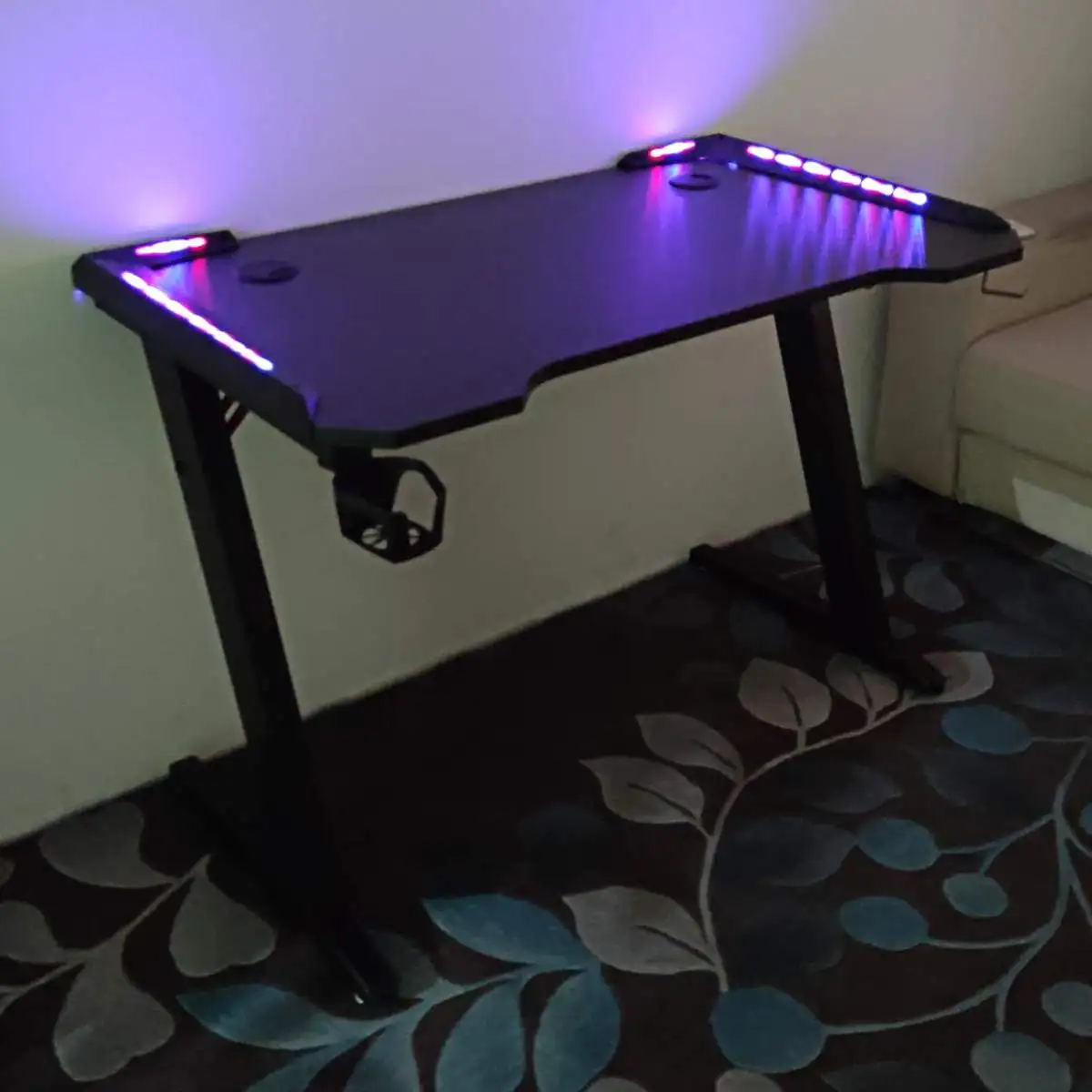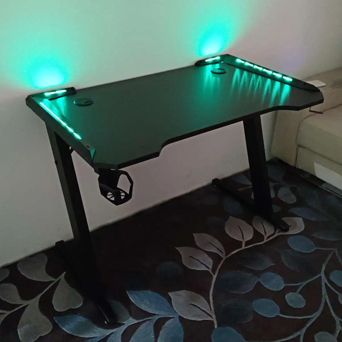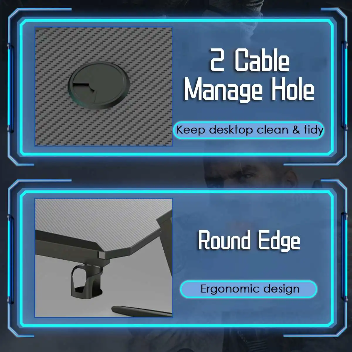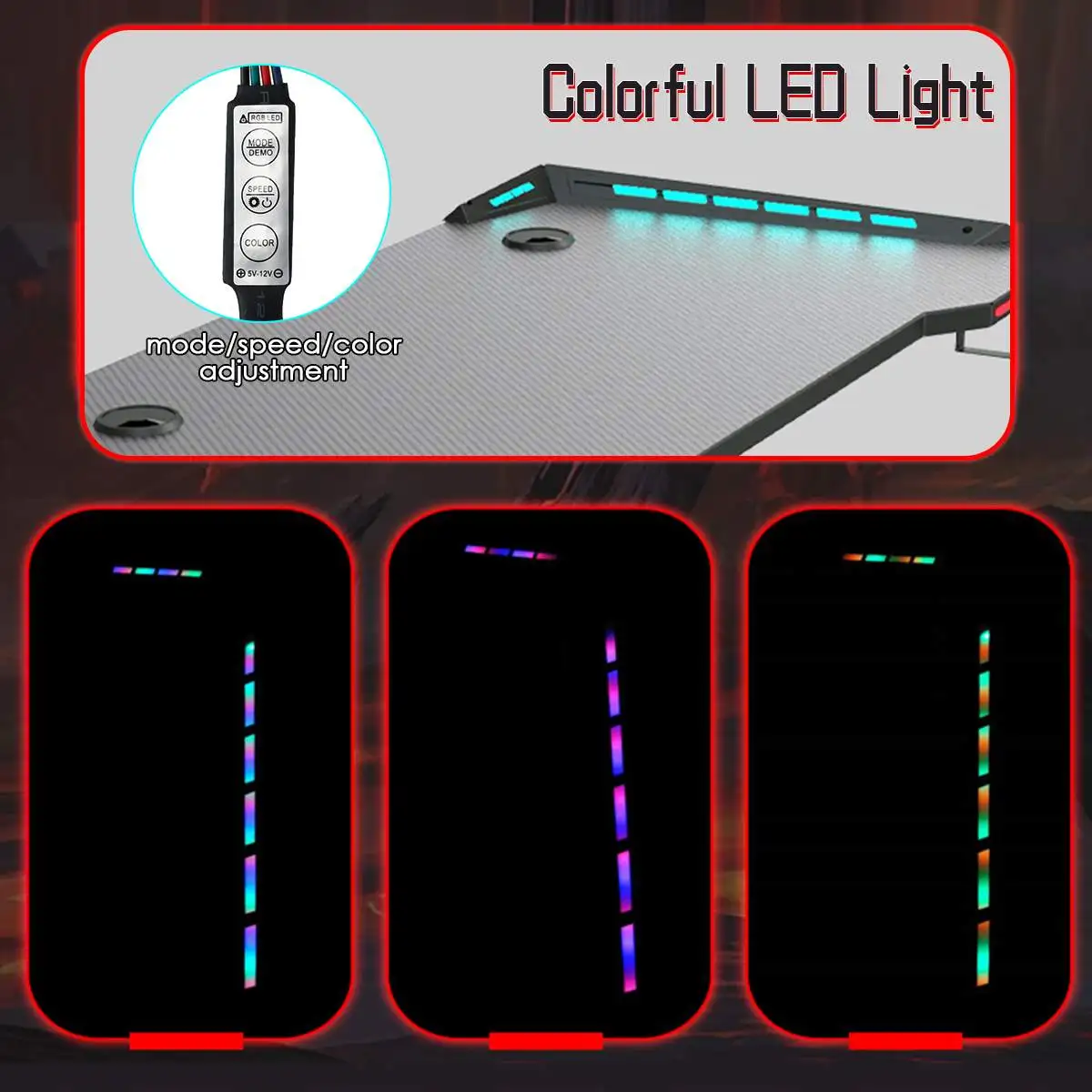 Особенности:-Светодиодный светильник на столе имеет 6 различных цветовых режимов. Светодиодный светильник: источник питания USB. (Подключи и работай)-Большое пространство для рабочего стола удовлетворяет ваши потребности, достаточно места для движения мыши и размещения различных ваших любимых игровых устройств.-Стабильная структура: Утолщенные встроенные z-образные металлические ножки стола могут позволить себе больший вес, а регулируемые подушечки для ног делают стол стабильным даже на неровном полу.-Эргономичный дизайн: крюк для наушников и подстаканник освобождает рабочее пространство, позволяет погрузиться в игру и пополнять энергию в любое время.-Держите Рабочий стол в чистоте и порядке: игровой стол поставляется с двойным кабелем для управления отверстием, может помочь вам освободить много места для рабочего стола. Поверхность из углеродного волокна, прочная, водонепроницаемая и противоскользящая.