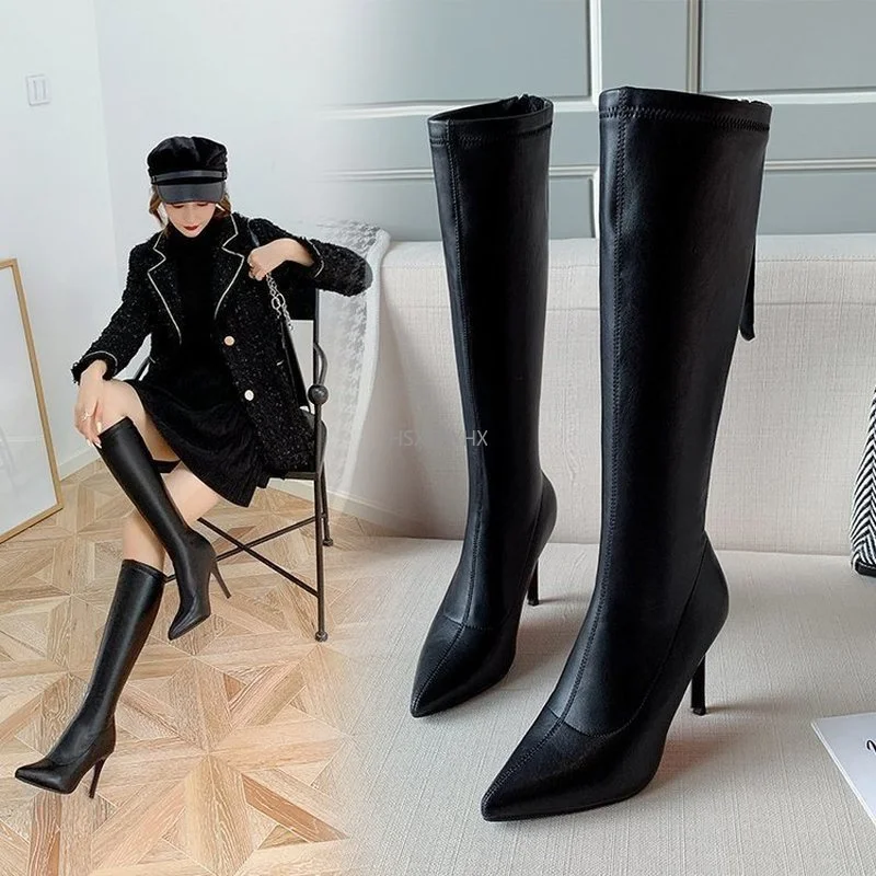 Женские сапоги выше колена, мягкая кожа, высокий тонкий каблук, заостренный носок, молния, пикантные высокие сапоги