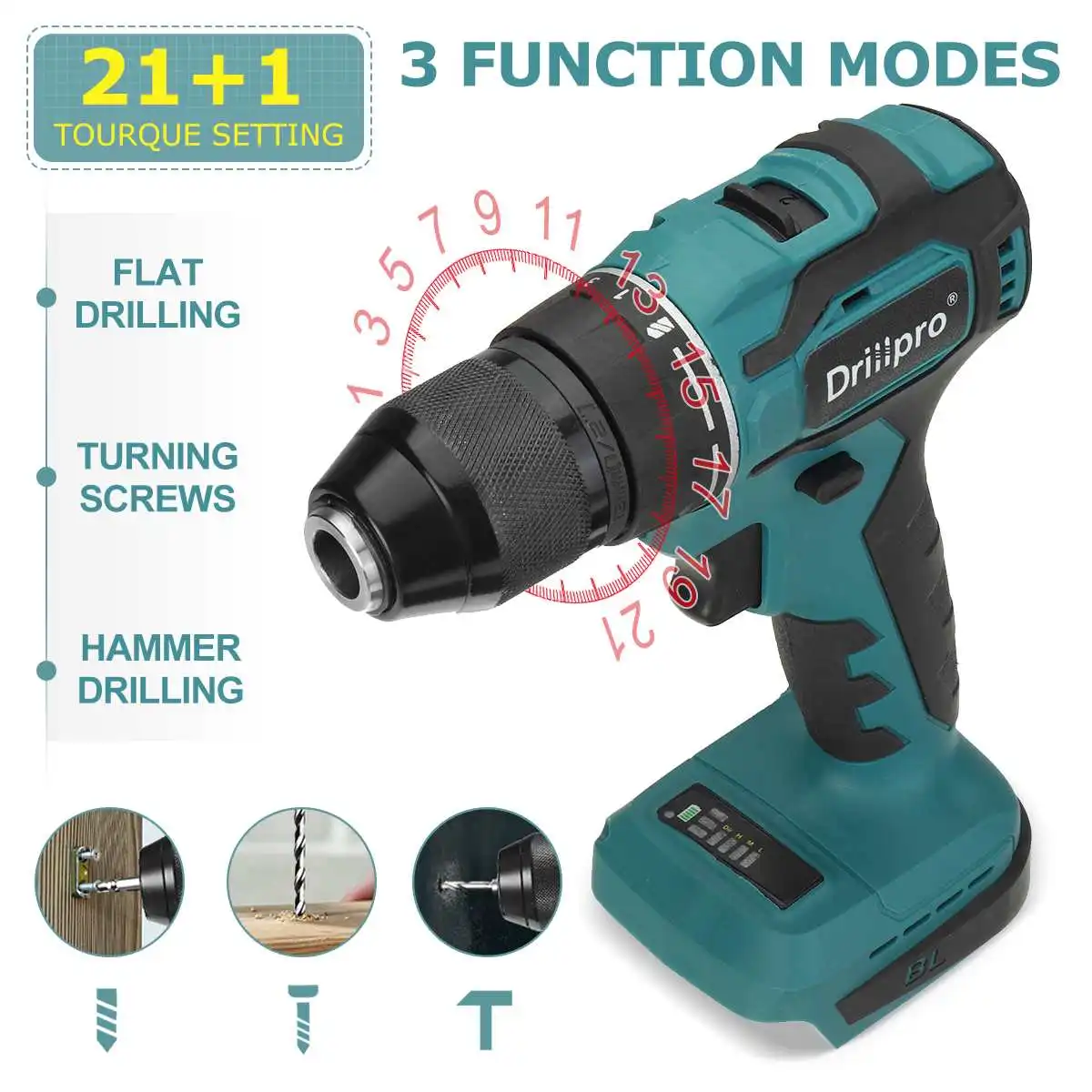 Характеристика:-Мощный бесщеточный двигатель обеспечивает до 23-48N.m крутящего момента и 1800 об/мин скорости.-21 + 1 настройки выбора крутящего момента обеспечивают наиболее подходящую силу сверления и точное управление для сверления в древесину, металл, пластик и все задачи отвертки.-2 настройки Переменной скорости для плавного завинчивания на низкой скорости и быстрого сверления на высокой скорости.-Функции вперед и назад позволяют Винтам управлять или откручивать с удобством.-Светодиодный светильник повышает видимость рабочей зоны, мягкая ручка уменьшает усталость во время использования.-Беспроводная Дрель имеет компактный легкий дизайн, избавьтесь от проблем с поиском гнезда для зарядки проводным сверлом.