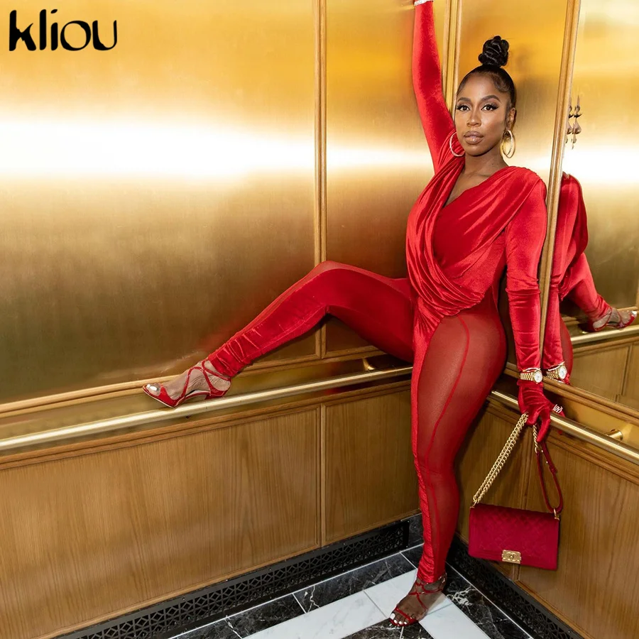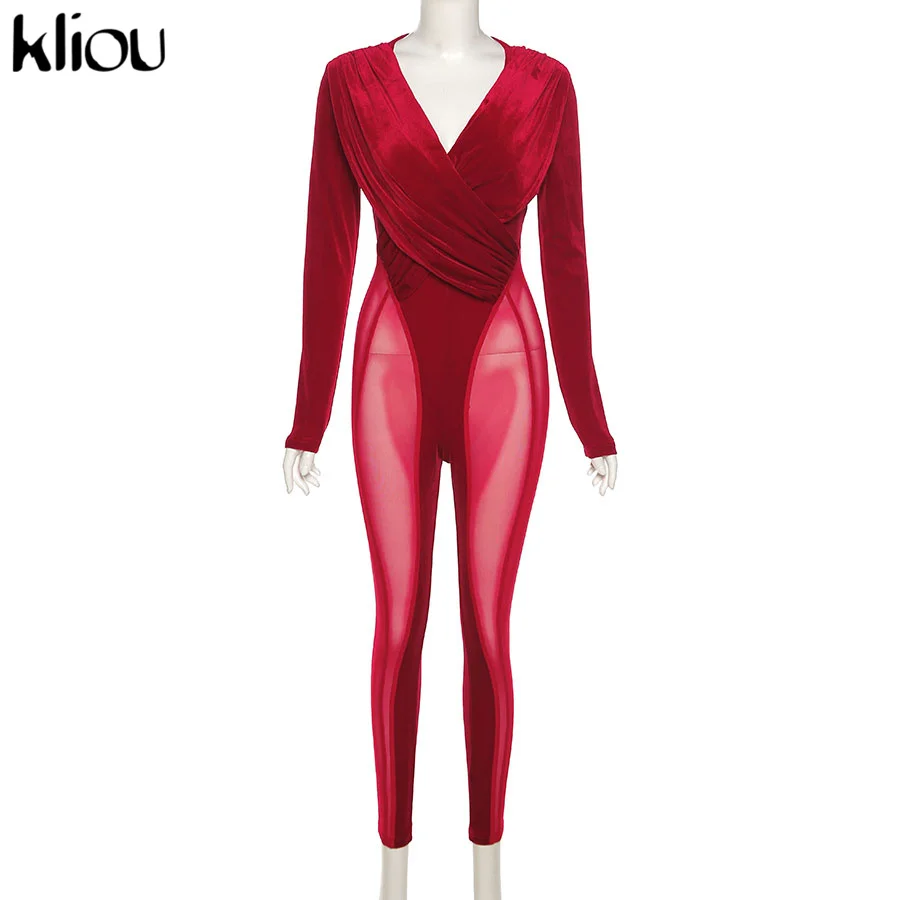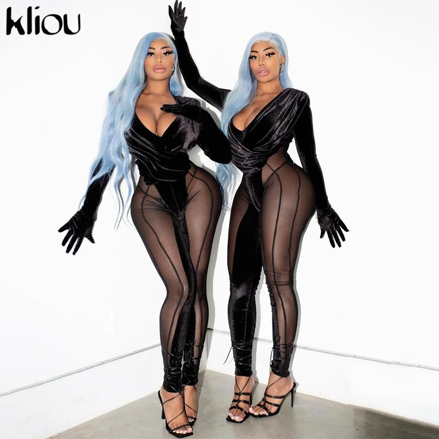 Женский сетчатый комбинезон Kliou, Осенний комбинезон с длинным рукавом и v-образным вырезом, прозрачная одежда, одежда в стиле хипстер