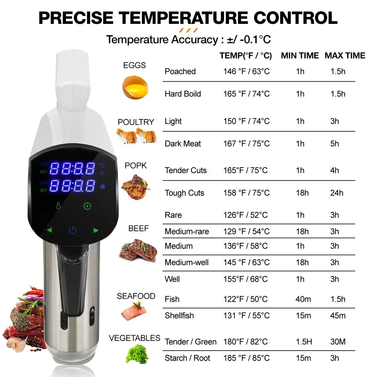 Точный контроль времени и температуры-- Большой ЖК-дисплей, гиперточный контроль температуры (+/-0,1 ℃), цифровой контроль температуры (25-92,5 ℃)(77 °F-198,5 °F) И контроль времени до минут. Приготовление пищи в домашних условиях обеспечивает и повышает безопасность пищевых продуктов