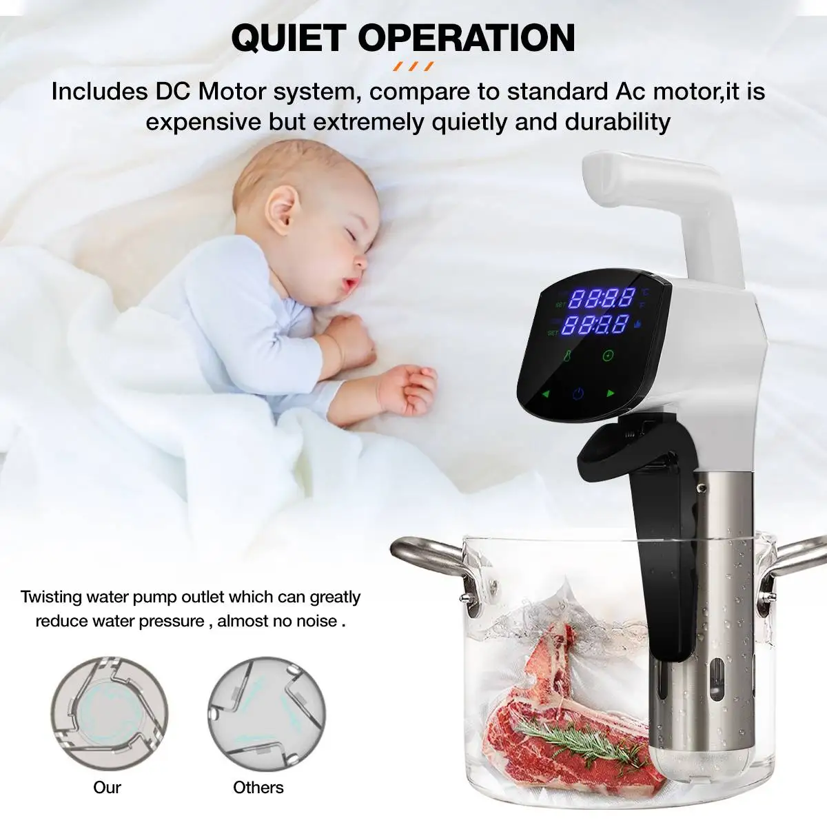 Мощный и гибкий-- Аппарат AUGIENB Sous Смотри имеет мощный насос, который равномерно сохраняет температуру жидкости на всей варочной ванне, что позволит вам получить больше времени, если вы многозадачны на кухне.