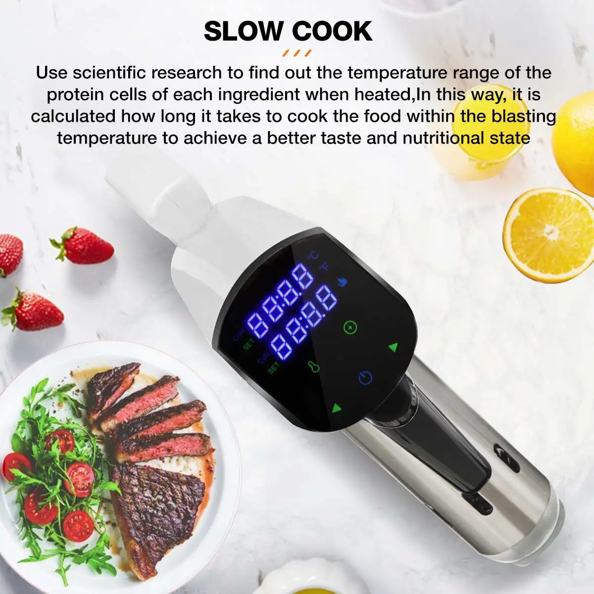 Легко использовать-- Просто прикрепите плиту Су-вид к кастрюле любого размера с помощью регулируемого зажима, а затем установите время и температуру, нажмите значок на сенсорном экране, чтобы включить/выключить и подтвердить настройки. Простота эксплуатации и выполнения в течение нескольких секунд.