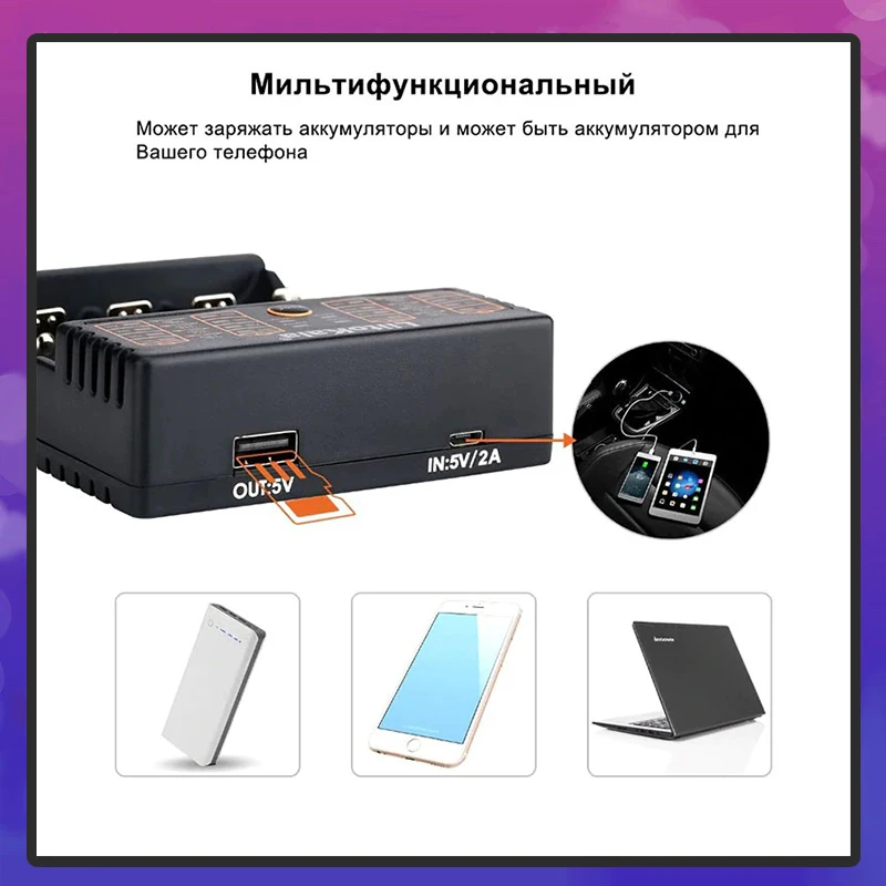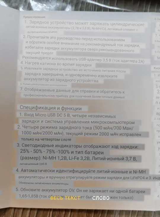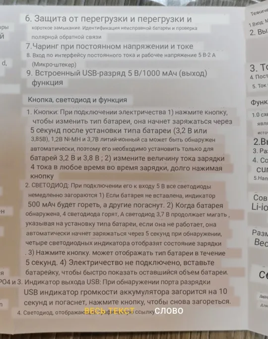 Функции:* Вход по интерфейсу постоянного тока и рабочее напряжение 5V-2A (Micro plug). Вход Micro USB DC 5V предназначен для четырех независимых зарядок с микрокомпьютерной системой управления.* Четыре режима зарядки тока, такие как 500 мАч, 700 мАч, 1000 мАч, 2000 мАч и 2000 мАч, зафиксированы только в четвертом слоте.* Светодиодные индикаторы отображают состояние зарядки, например, 25%, 50%, 75%, 100% и тип батареи, например, Ni-MH 1,2 В, Li-Fe 3,2 В, Li-ion 3,7 В, Li-ion 3,85 В.* Встроенная функция разряда (выхода) USB 5 В / 1000 мАч. Определите литий-ионные и никель-металлогидридные батареи автоматически и вручную отрегулируйте режим зарядки для литий-ионных батарей LiFePO4 и 3,85 В.* Обновить для батареи OV. Он не может заряжать любую батарею с напряжением от 1,65 до 1,85 В (может быть обнаружен только ток обновления). Защита от перезаряда, чрезмерной разрядки и короткого замыкания. Выявить неисправный аккумулятор и полярный обратный осмотрПримечание:1 Зарядное устройство может заряжать цилиндрические литий-ионные аккумуляторы (3,7 В и 3,8 В), Ni-MH / Cd, литиевый элемент с фосфатом железа (LiFePO4)2 Перед использованием прочитайте данное руководство и обратите особое внимание на рекомендуемый зарядный ток, не допускайте зарядки аккумулятора сверх рекомендуемого предела тока. 3 Рекомендуется USB-адаптер 5 В (ток адаптера 2А).Спецификация:Вход: Micro USB DC 5V / 2AВыход: 1,42 В, 4,2 В ± 0,05 В, 3,65 ± 0,05 В, 4,35 ± 0,05 ВФункция выхода USB:Ток: 2000 мА * 1 1000 мА * 2 700 мА * 3 500 мА * 4Постоянное напряжение, ток отключения: менее 100 мАчТок в режиме ожидания: менее 15 мАчНапряжение холостого хода на выходе USB: 4,9-5,3 В; и 4-й слот фиксирован для источника питания разряда USBВыходной ток: 1000 мАчТок холостого хода: <1 мАчСоответствующее напряжение 4,75-5,25 В при токе 1000 мАчНапряжение отключения для защиты от разряда: 3,0 ± 0,1 ВРазмер элемента: прибл. 11 * 8,8 * 2,8 см / 4,33 * 3,46 * 1,10 дюйма