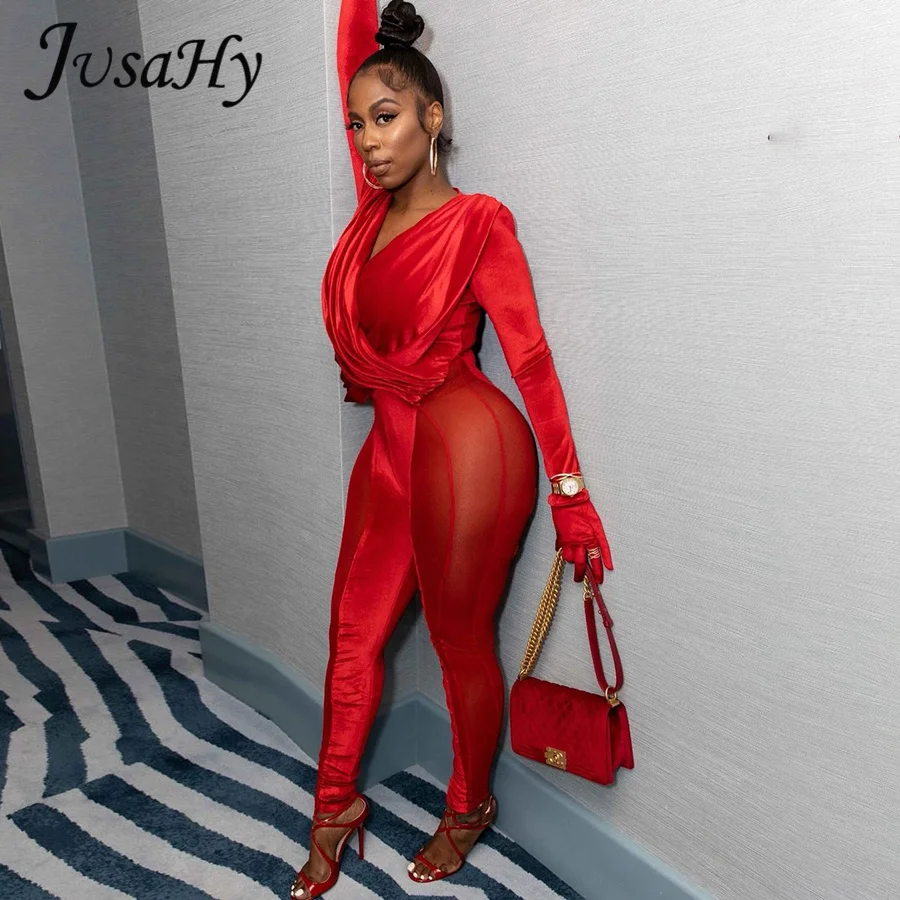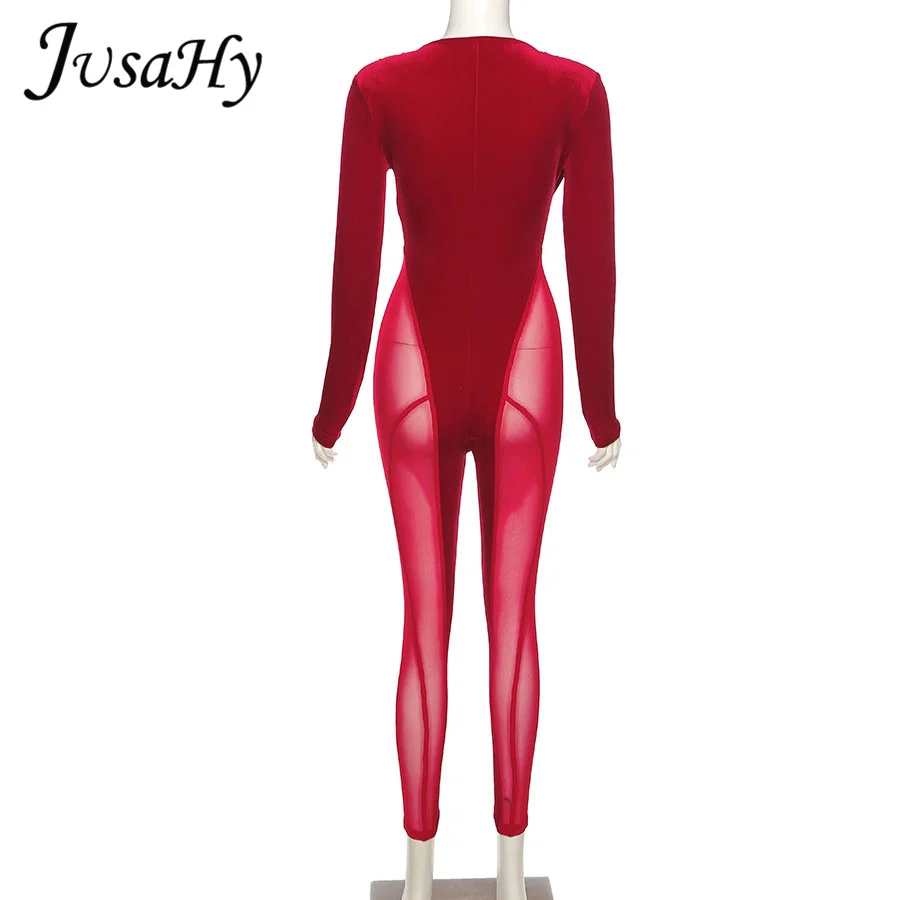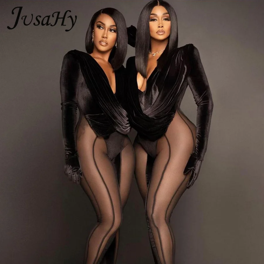 Осенние однотонные бархатные комбинезоны JuSaHy в стиле пэчворк для женщин, сексуальные сетчатые длинные брюки с V-образным вырезом и длинными рукавами, женские уличные Комбинезоны для вечерние