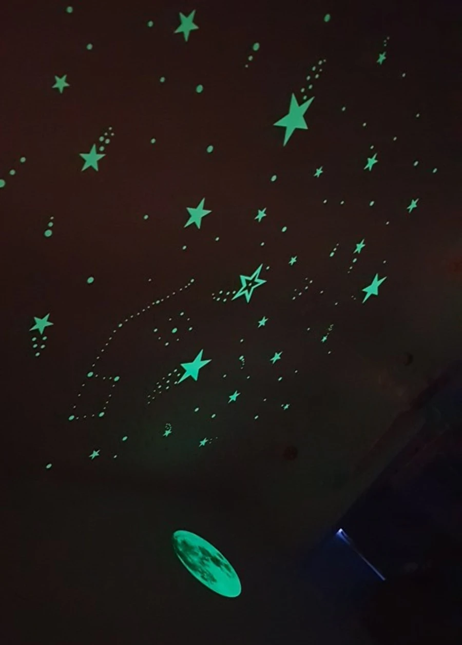 4. Украшение для детской комнаты-наклейки на стену со звездами и Луной идеально подходят для настенного украшения потолка детской комнаты, украшения стен детской комнаты, в качестве подарка на день рождения для взрослых или детей. Детский душ, праздничные подарки, просто оставьте свет включенным перед сном, чтобы зарядить, затем в темноте прищурите эти глаза и Ударьте! Ты в космосе.