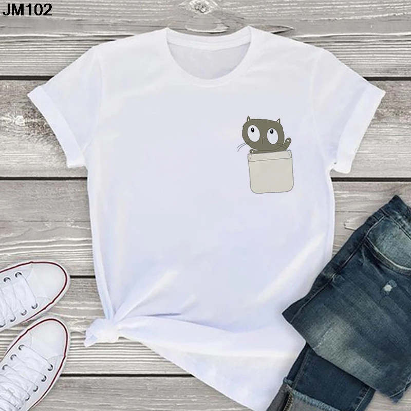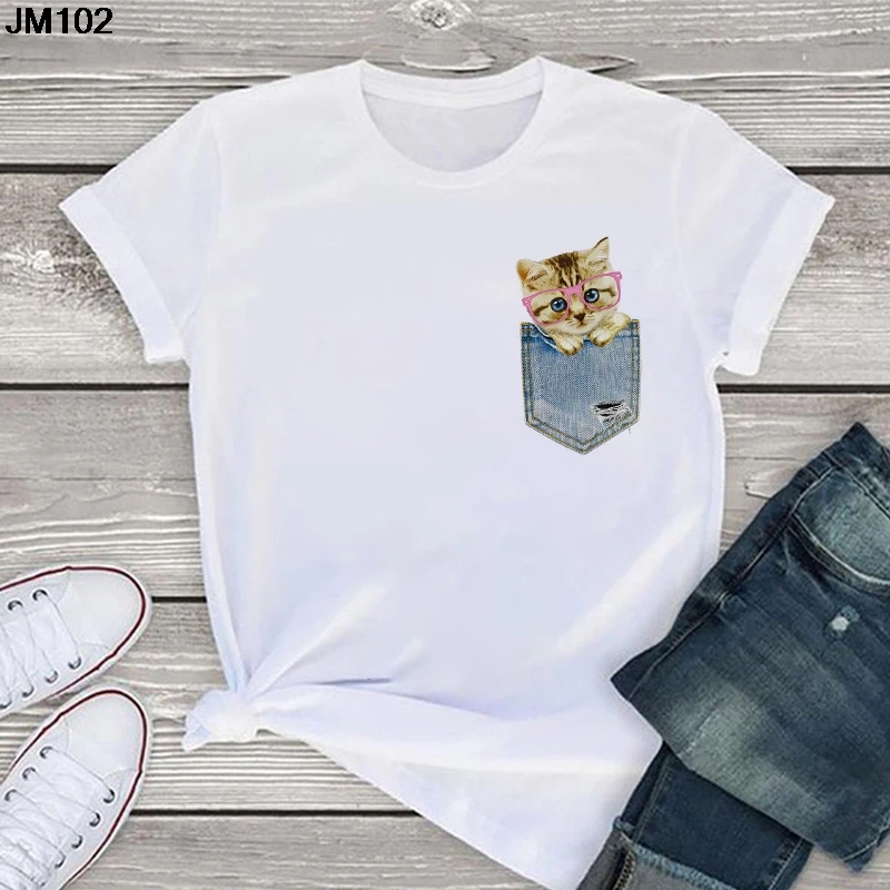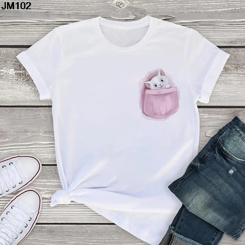Женская футболка с коротким рукавом, белая футболка с забавным принтом животных и карманами в стиле Харадзюку, уличная одежда на лето