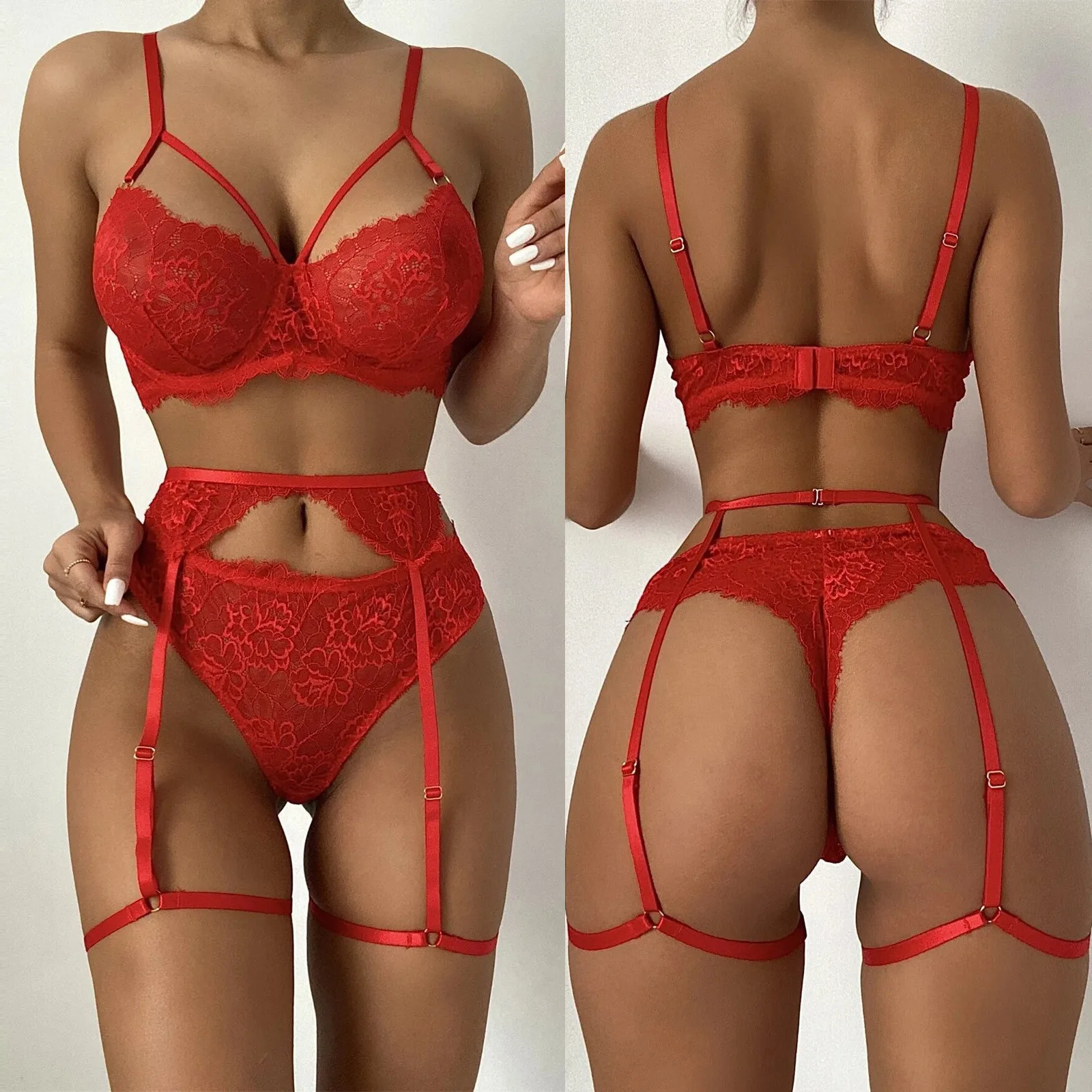 Красный кружевной бюстгальтер стринги комплект нижнего белья с подвязка эротическая женское белье сексуальное нижнее белье Прозрачный сексуальный костюм Lenceria чувственный Mujer