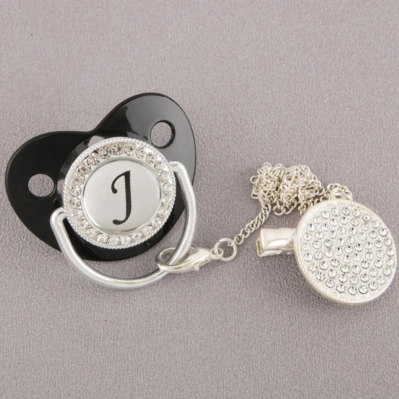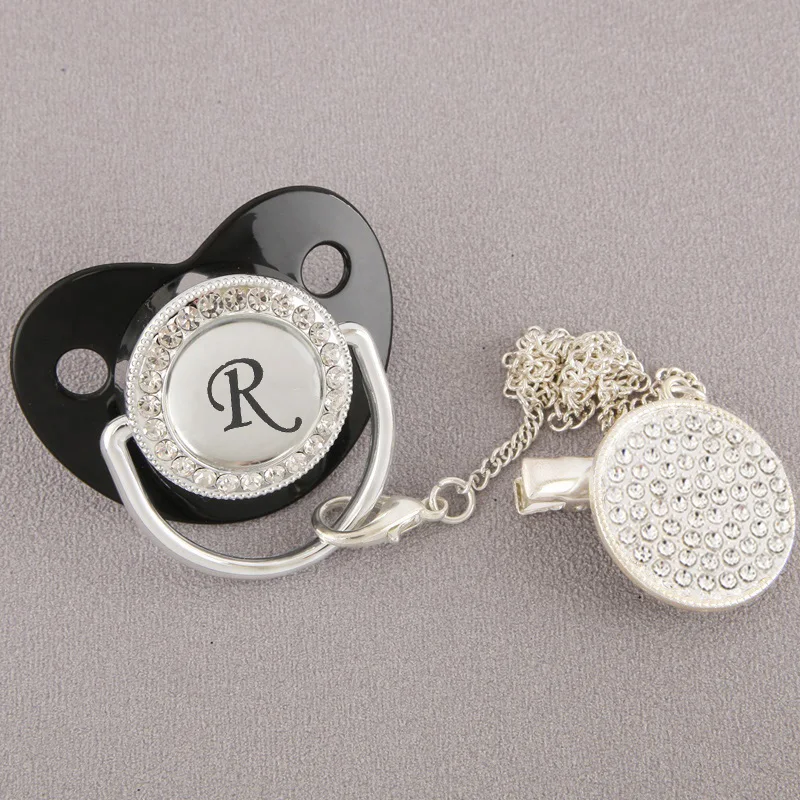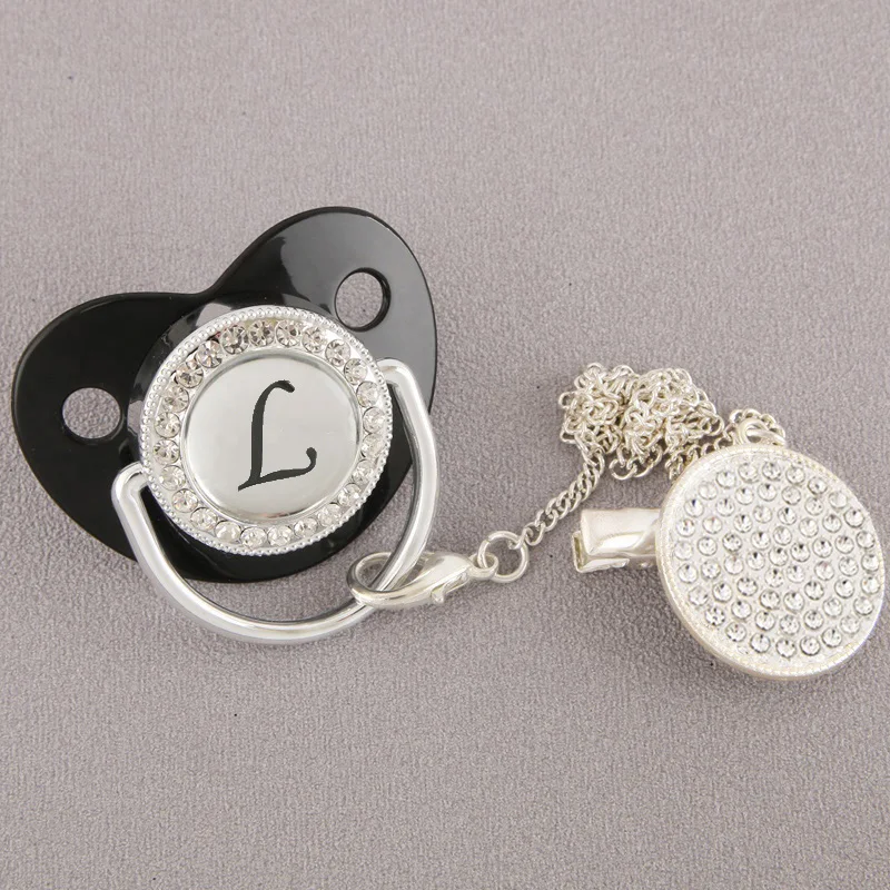 Роскошная блестящая детская пустышка с зажимом и цепочкой BPA бесплатно для новорожденных силиконовая соска-пустышка черного и серебристого цвета 26 инициалов соска для младенцев подарок для душа