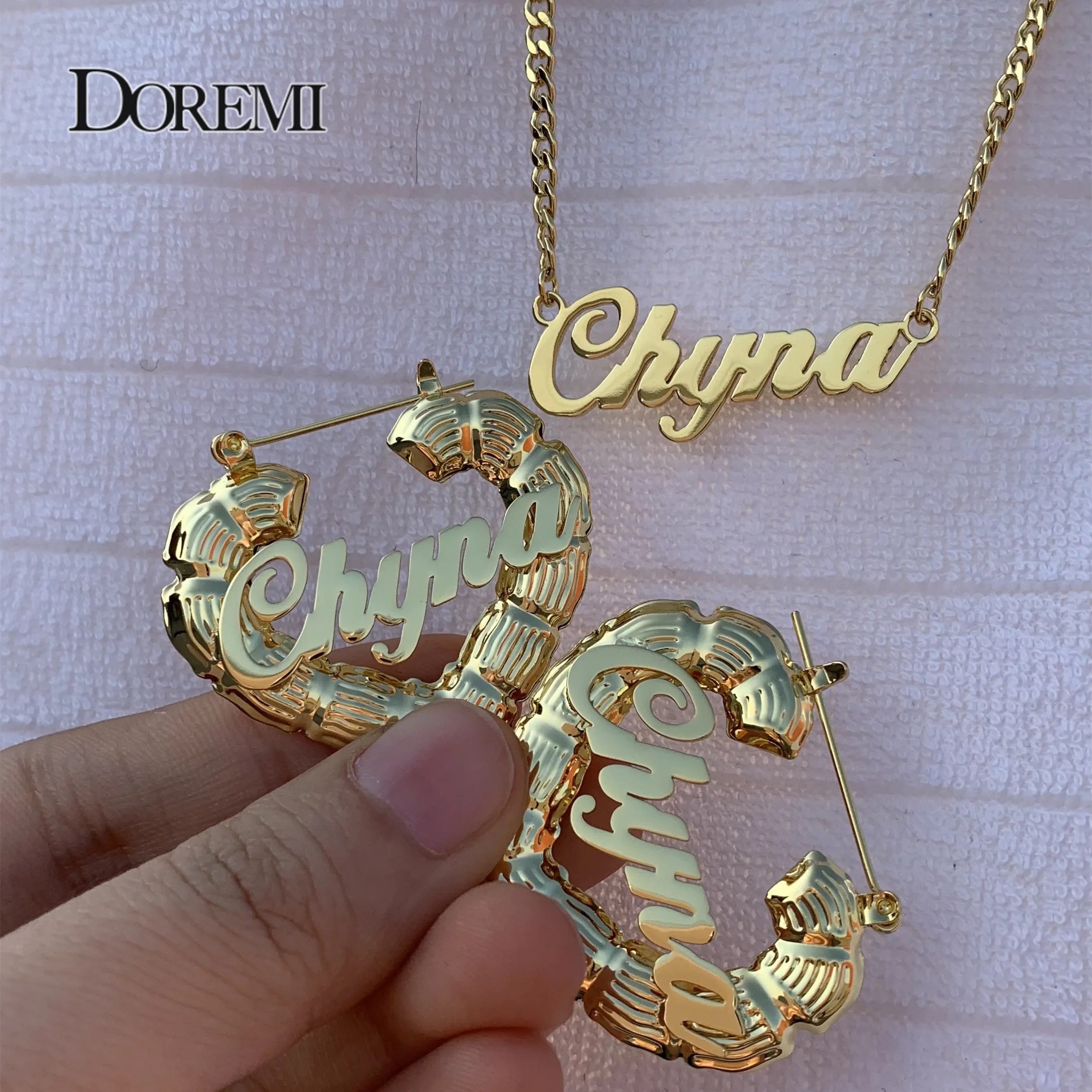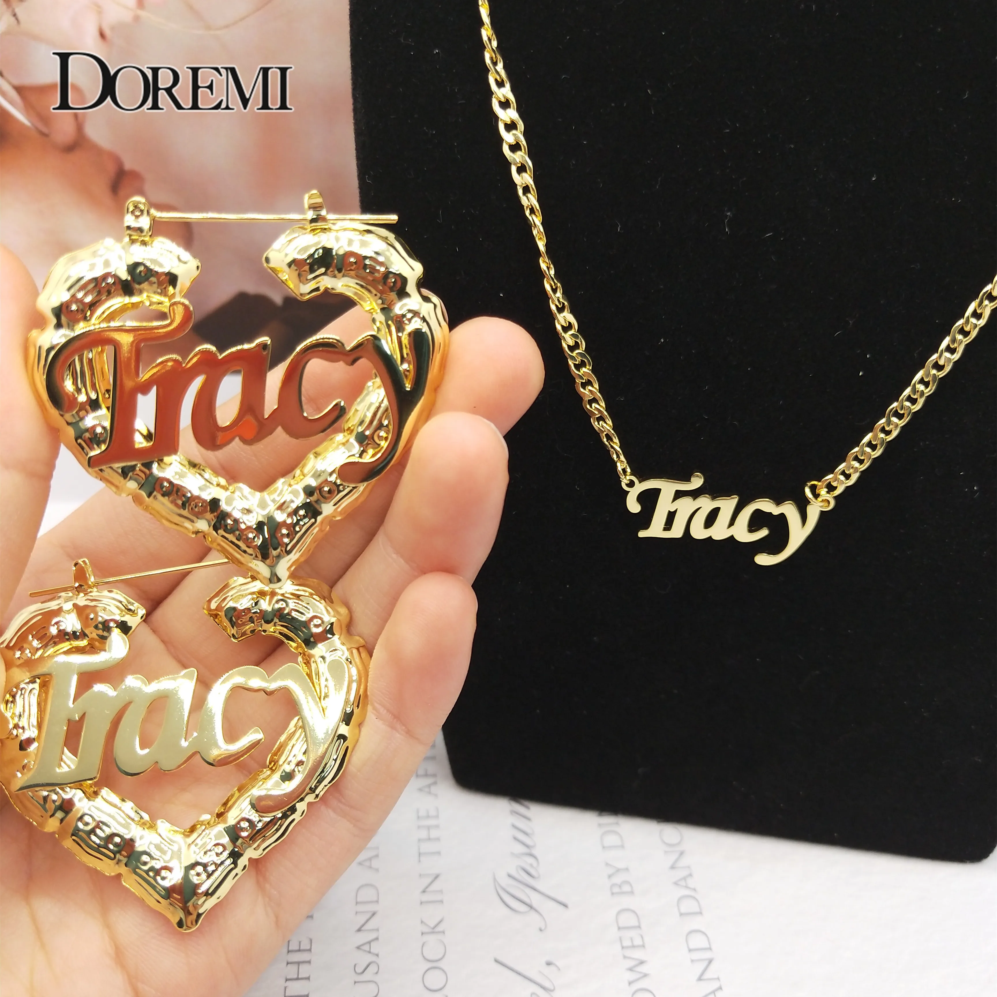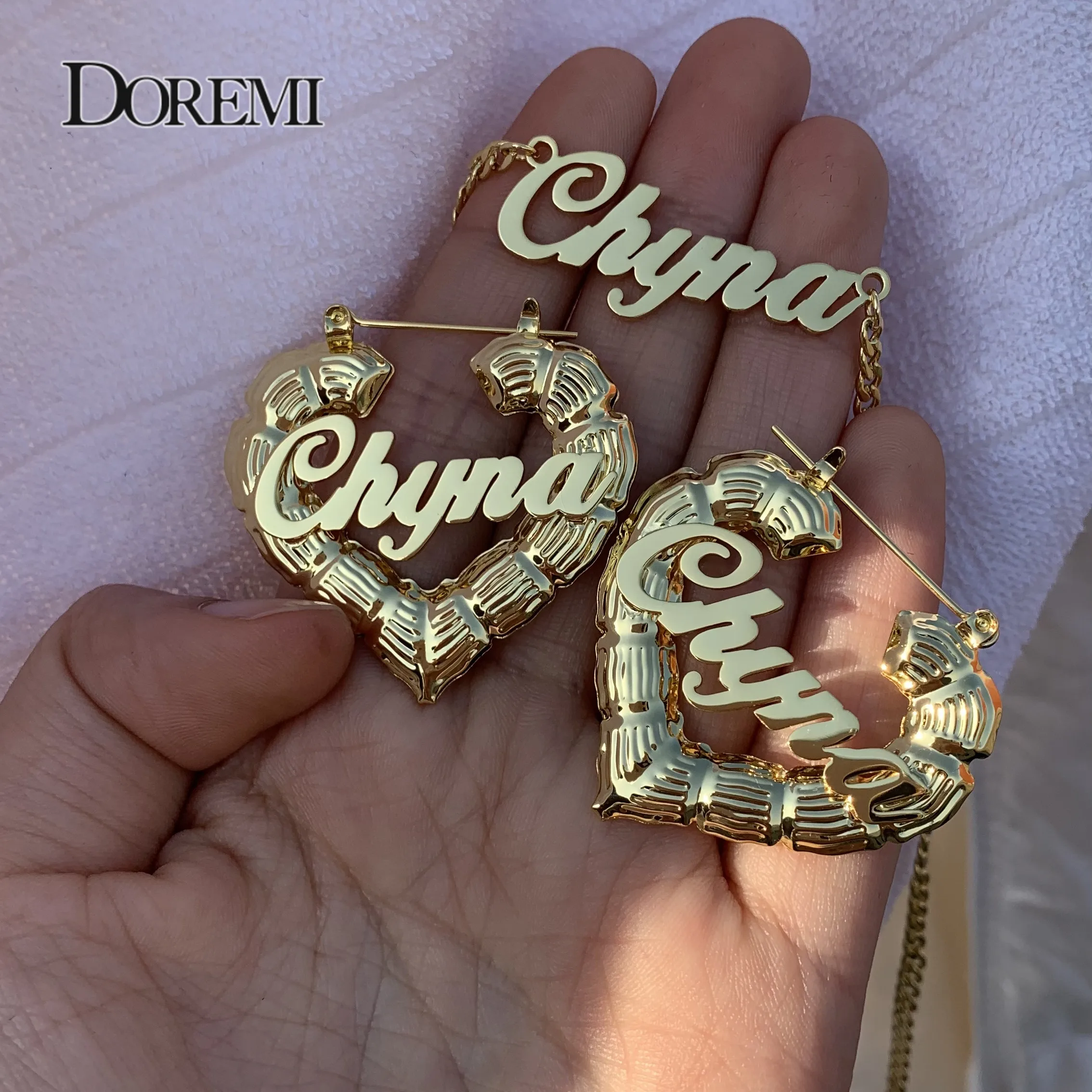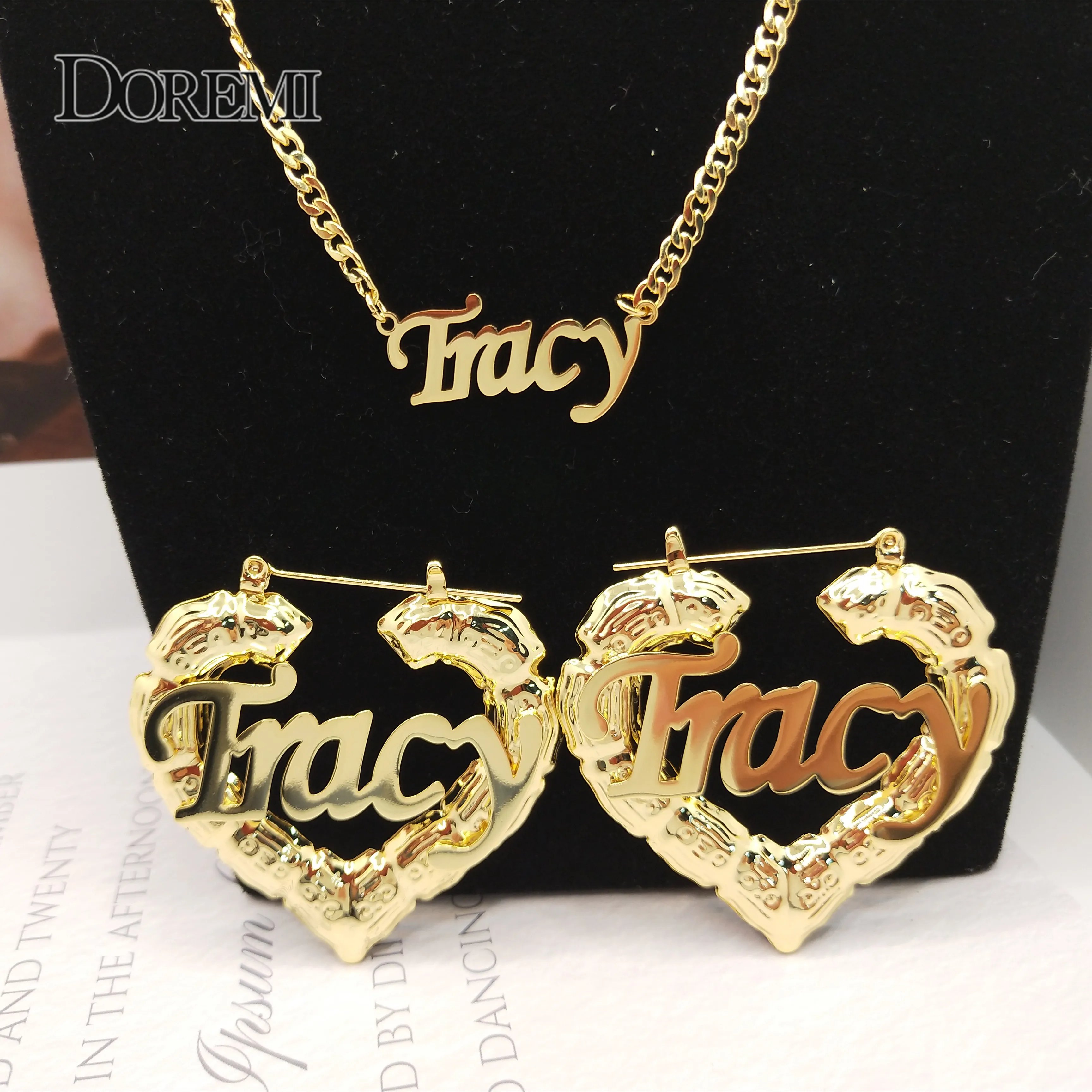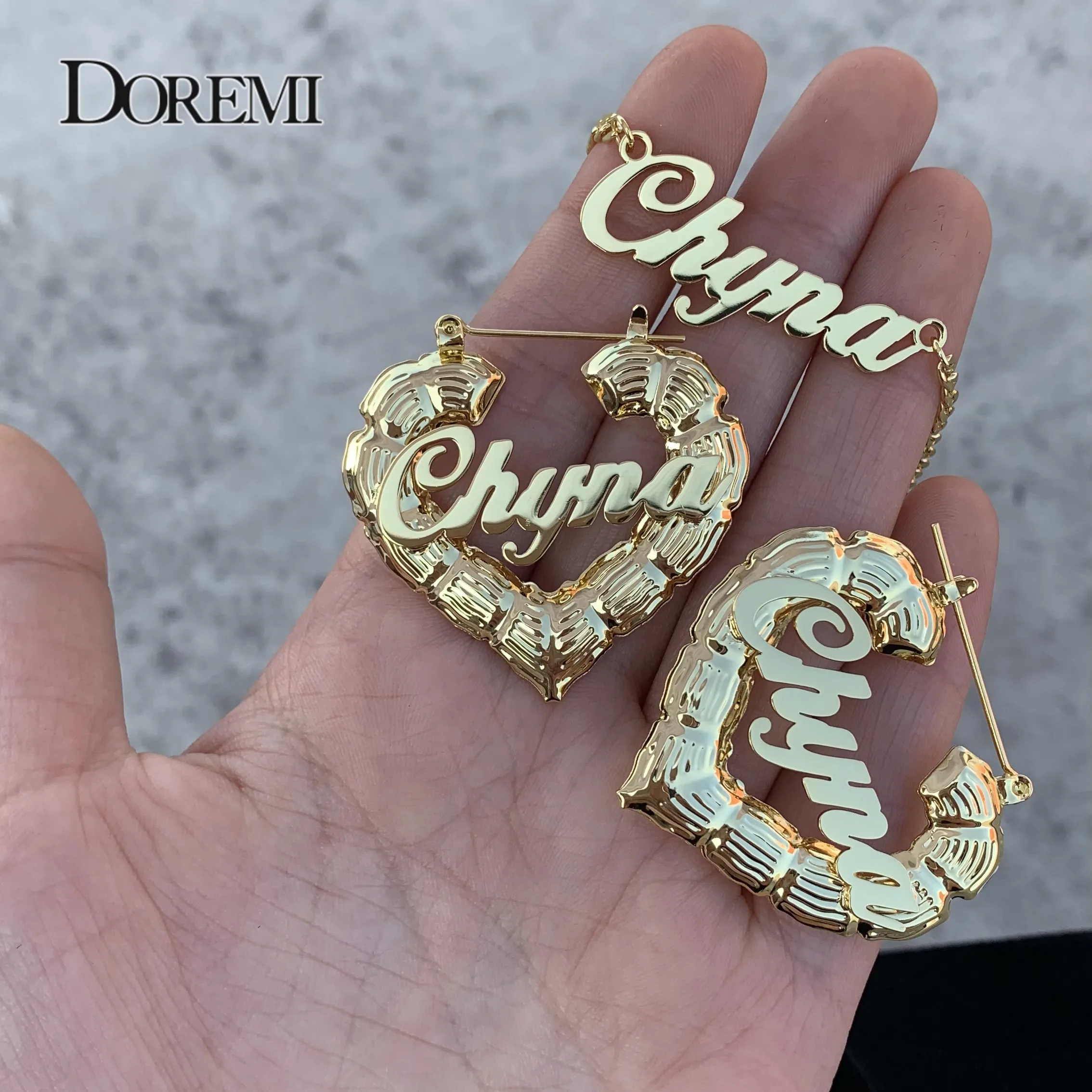 Набор серег и ожерелья DOREMI с именем, серьги в форме сердца, бамбука, 3 мм, кубинская цепочка, персонализированные серьги с капюшоном из бамбука на заказ