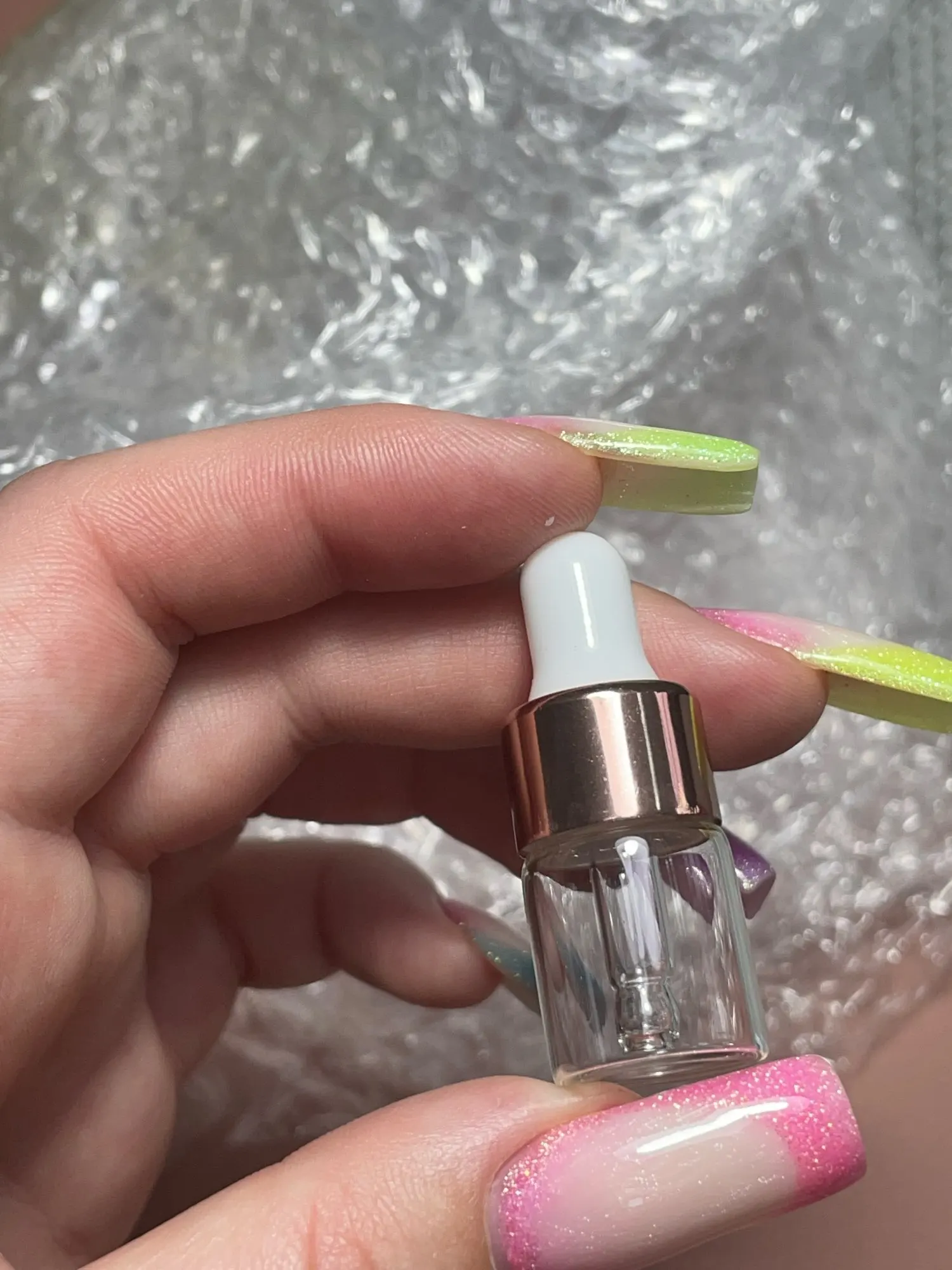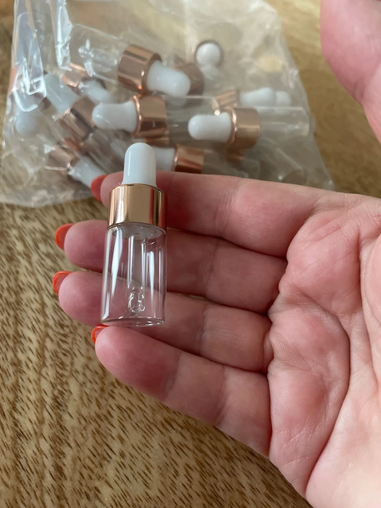 Очень красиво и мило. Идеально подходит для приготовления масел для ногтей моих клиентов. Плохая деталь в том, что капельница не достигает дна и не достигает конца продукта. Я купил 2 мл, следующий я куплю 3 мл.