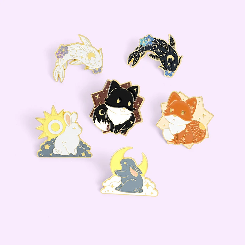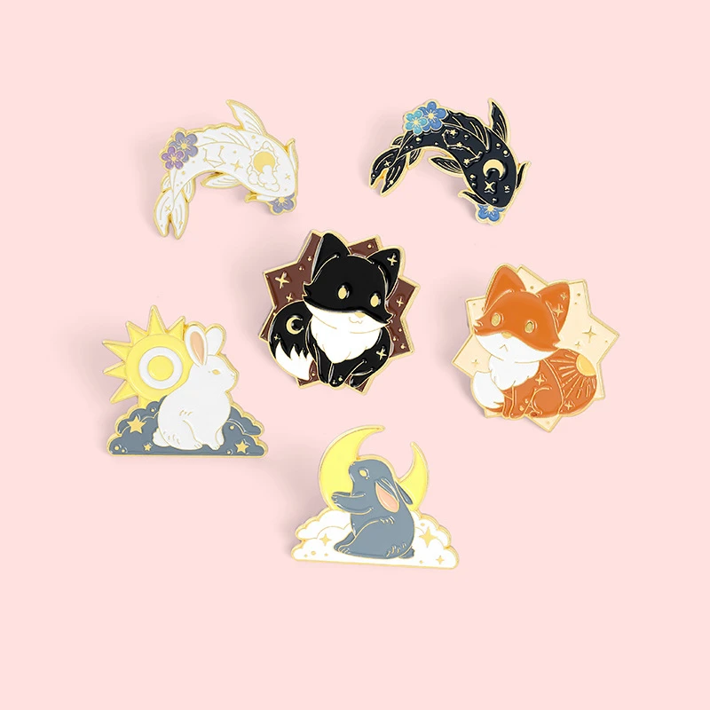 Креативные эмалевые заколки с изображением Солнца и Луны парные животные лиса кролик брошь с рыбой Нагрудный значок Сумка Мультяшные ювелирные изделия подарок для ребенка друга