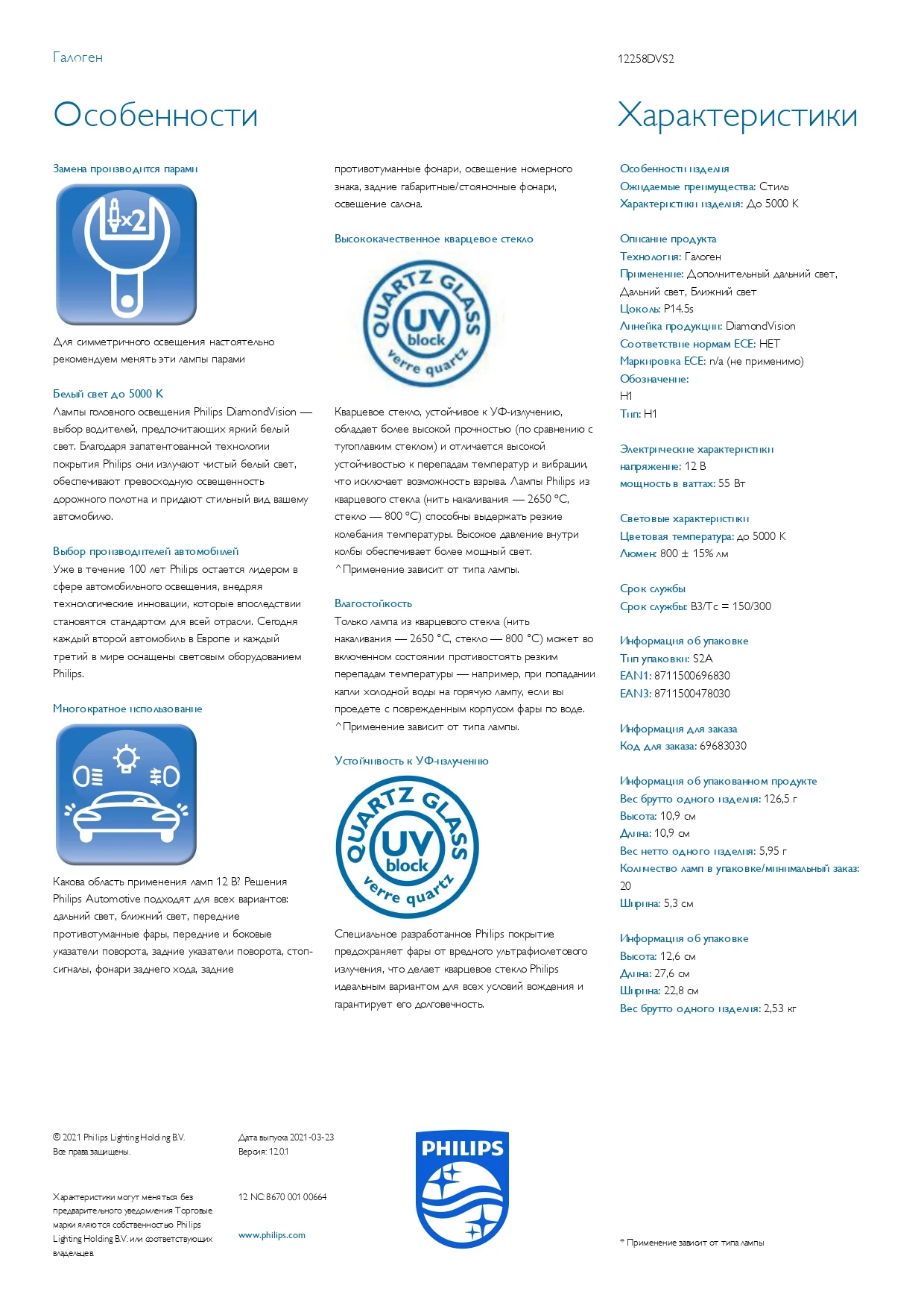 Галогенная лампа H1 PHILIPS DiamondVision 12V-55W (2шт) 12258DVS2