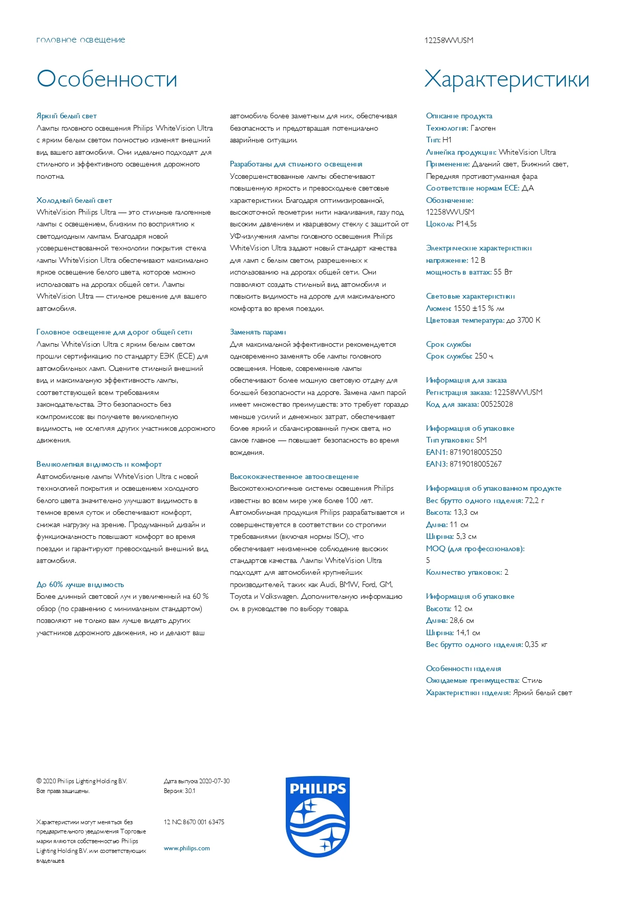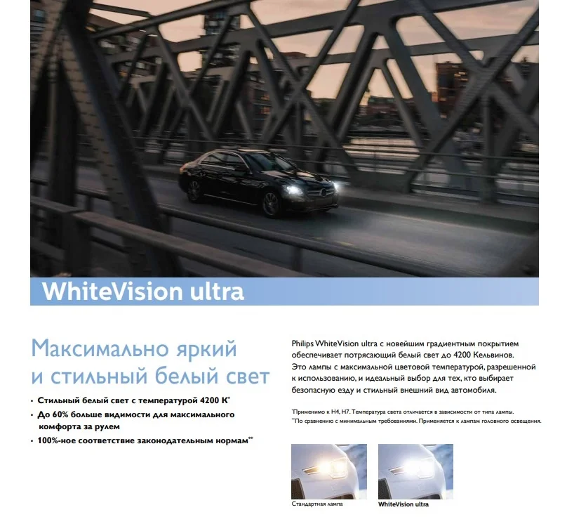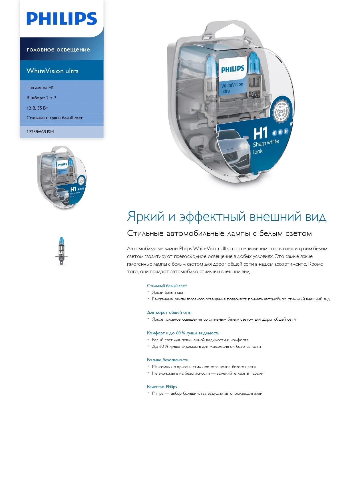 Галогенная лампа H1 PHILIPS WhiteVision ultra 12V-55W +W5W (2шт.) 12258WVUSM