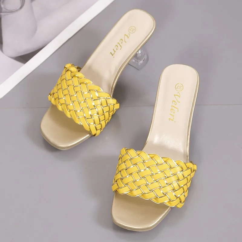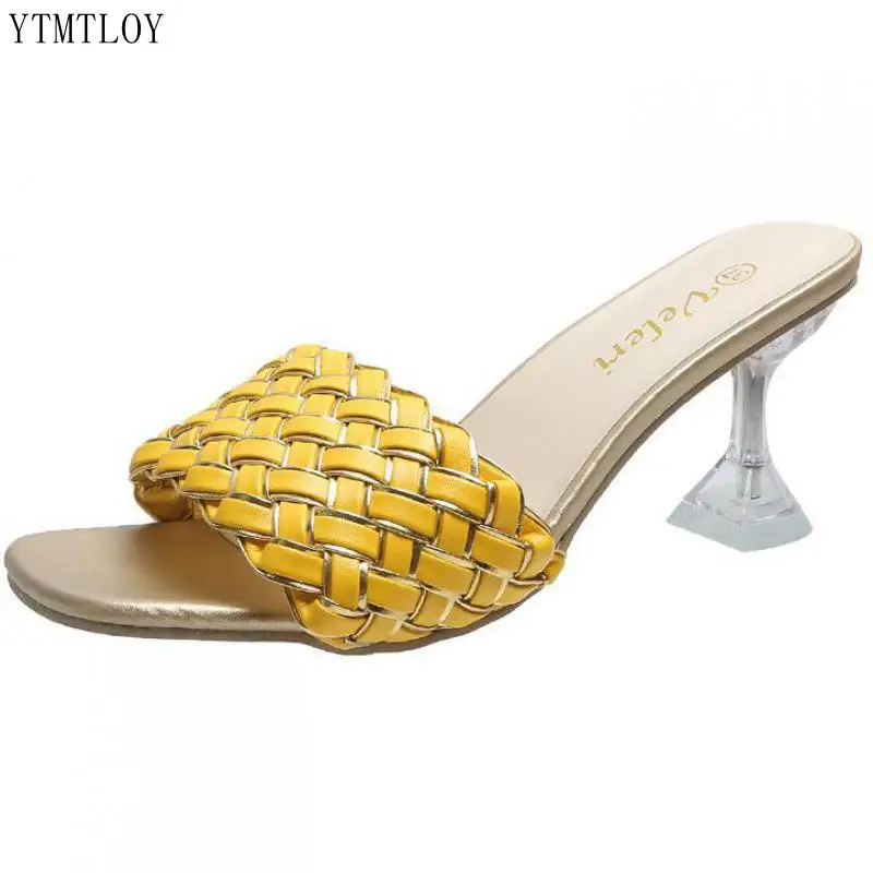 Женские босоножки на высоком каблуке, желтые сетчатые туфли-лодочки...