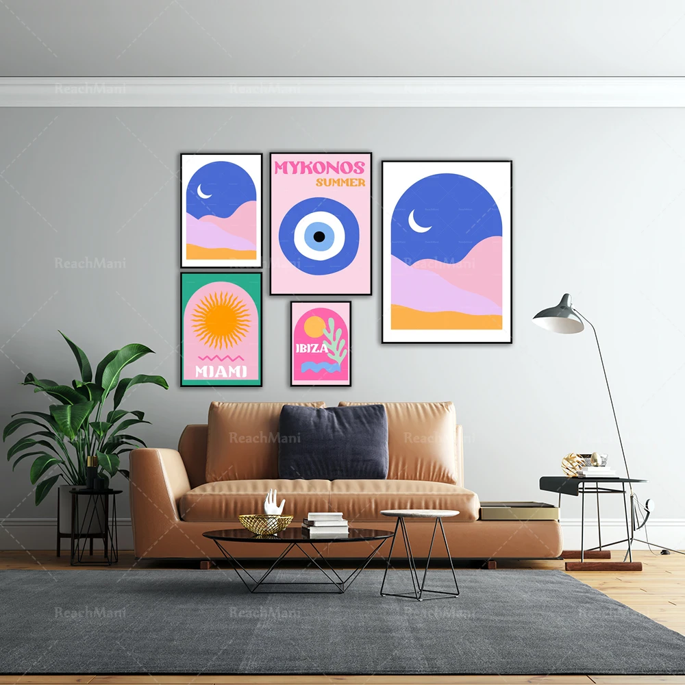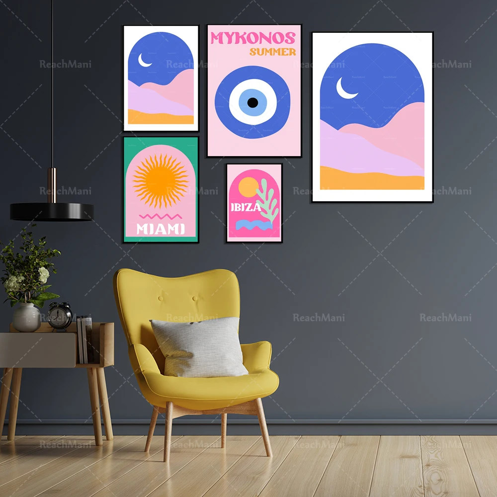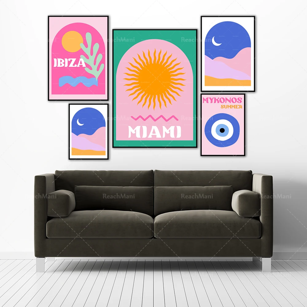 Художественные принты Mykonos, принты Майами, розовые фрески с изображением итальянской остроты Ibiza, принты ассулина, сглаза, путешествия, галереи, вечерние