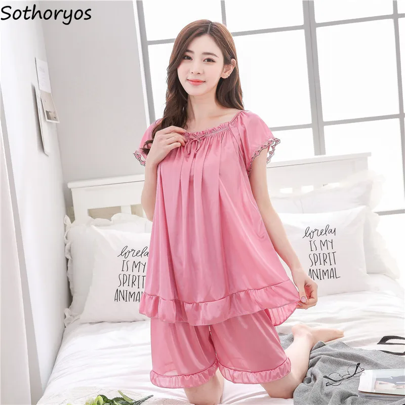 Пижамный комплект женский с круглым вырезом, кружевные топы с коротким рукавом для сна, дышащая элегантная однотонная одежда для сна в Корейском стиле, модная одежда для сна оверсайз