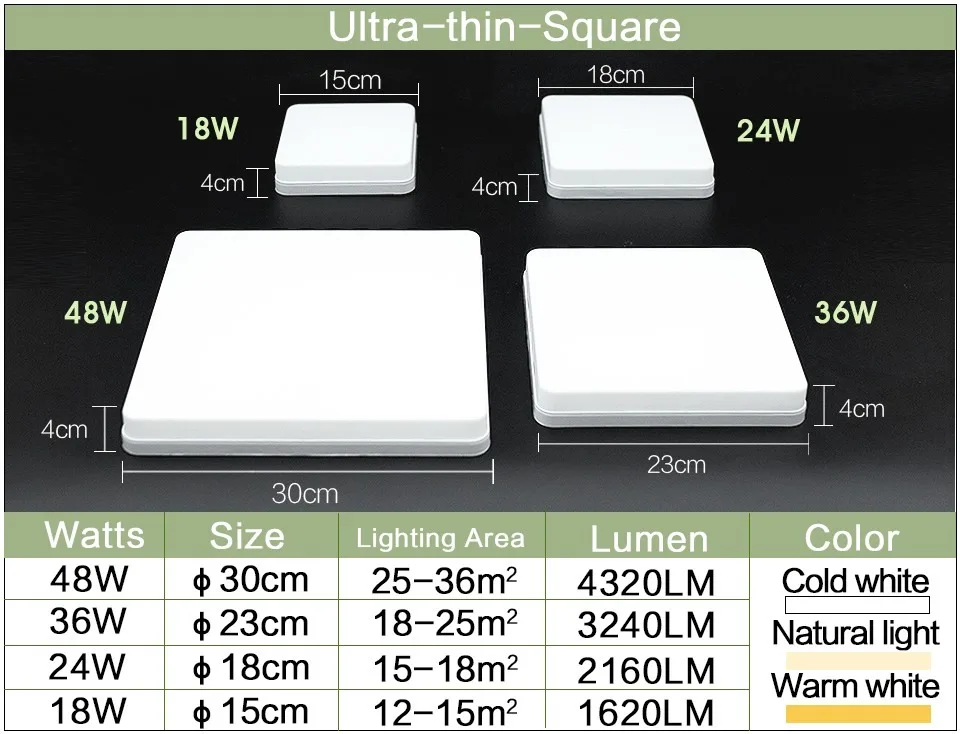 -Мощность: 18 Вт, 24 Вт, 36 Вт, 48 Вт-Люмены: 1620lm, 2160lm ,3240lm, 4320lm;-Напряжение: AC86-265V,(110 В/220 В можно использовать);-Форма: круглая/квадратная;-Срок службы: 300 000 часов;-Цвет: теплый белый (2700K)/холодный белый (6000K)/естественный светильник (3300K);-Гарантийный срок: 1 год