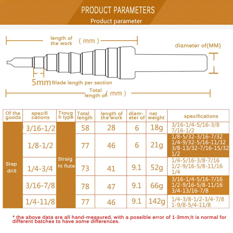 Посылка включает в себя 5 различных размеров ступенчатых сверл, которые могут удовлетворить ваши различные потребности в использовании в соответствии с практическими условиями.