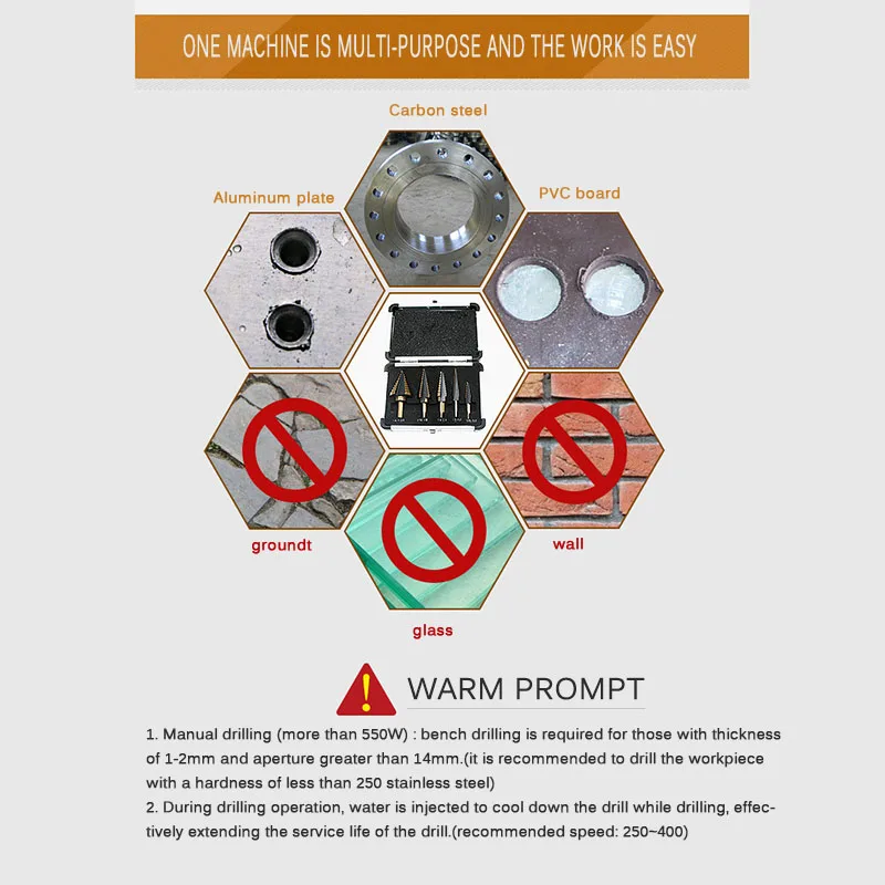 Ступенчатая дрель широко подходит для строительства, дома, DIY и так далее.