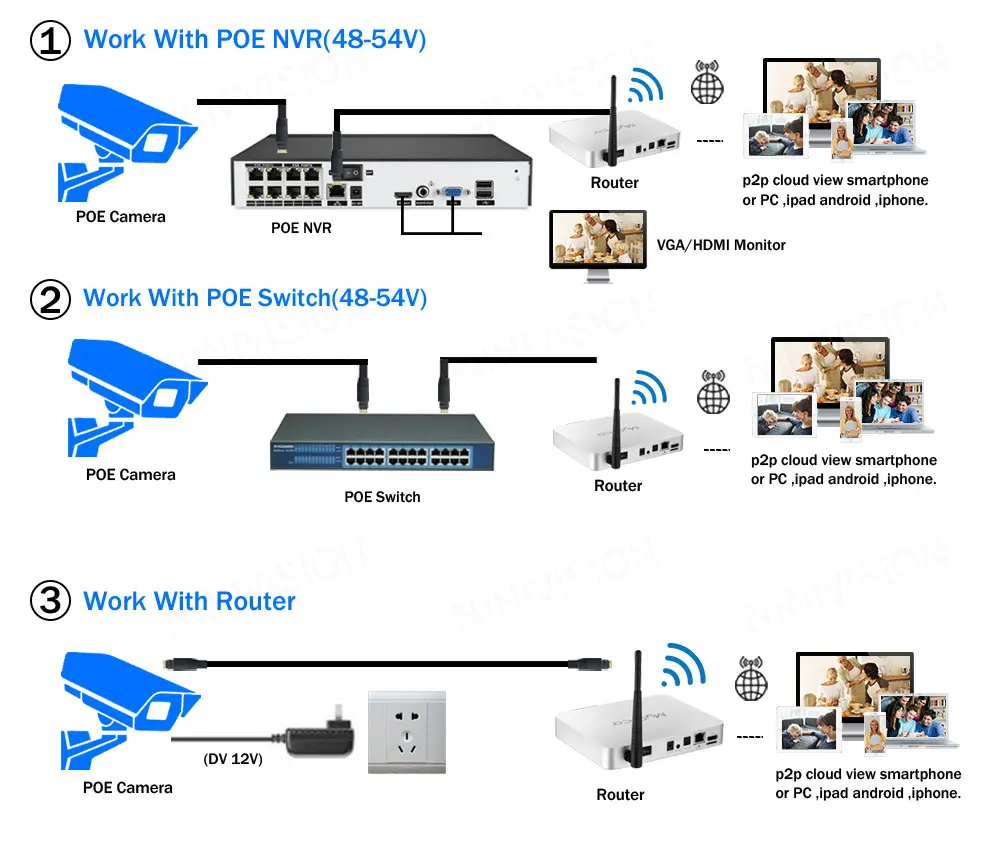 Не нужны дополнительные кабели питания или адаптеры или переключатели. Подключи и работай и простая настройка.Экономьте деньги и удобно, POE NVR = NVR + POE коммутатор.