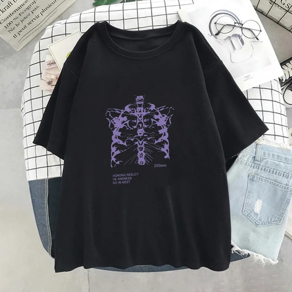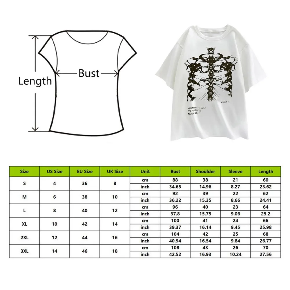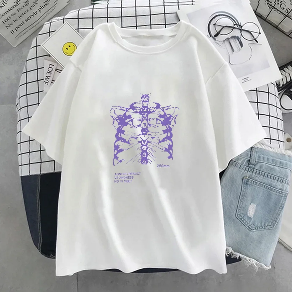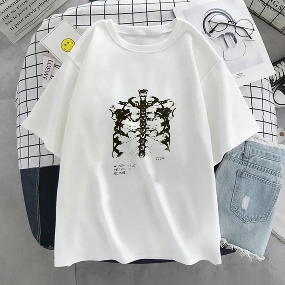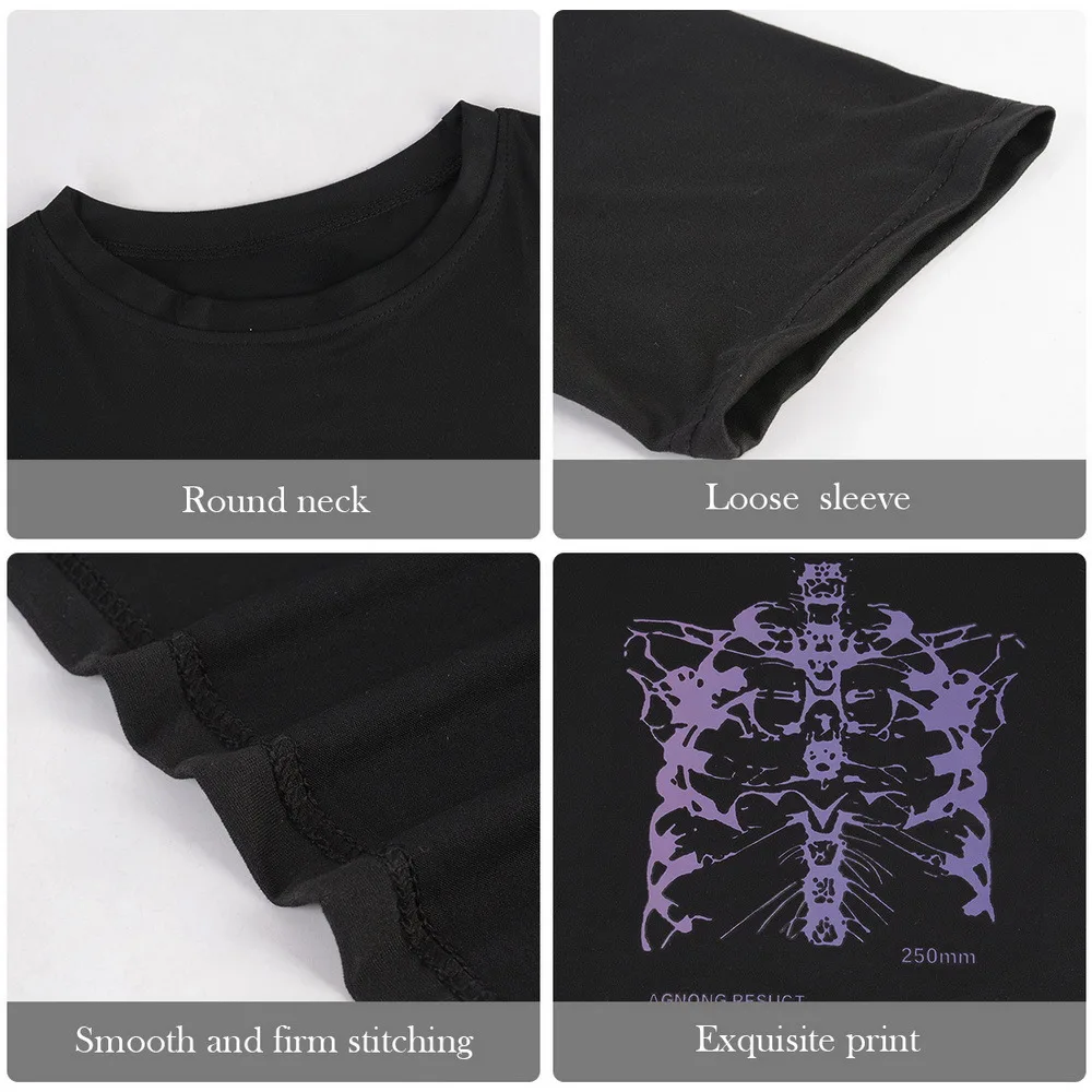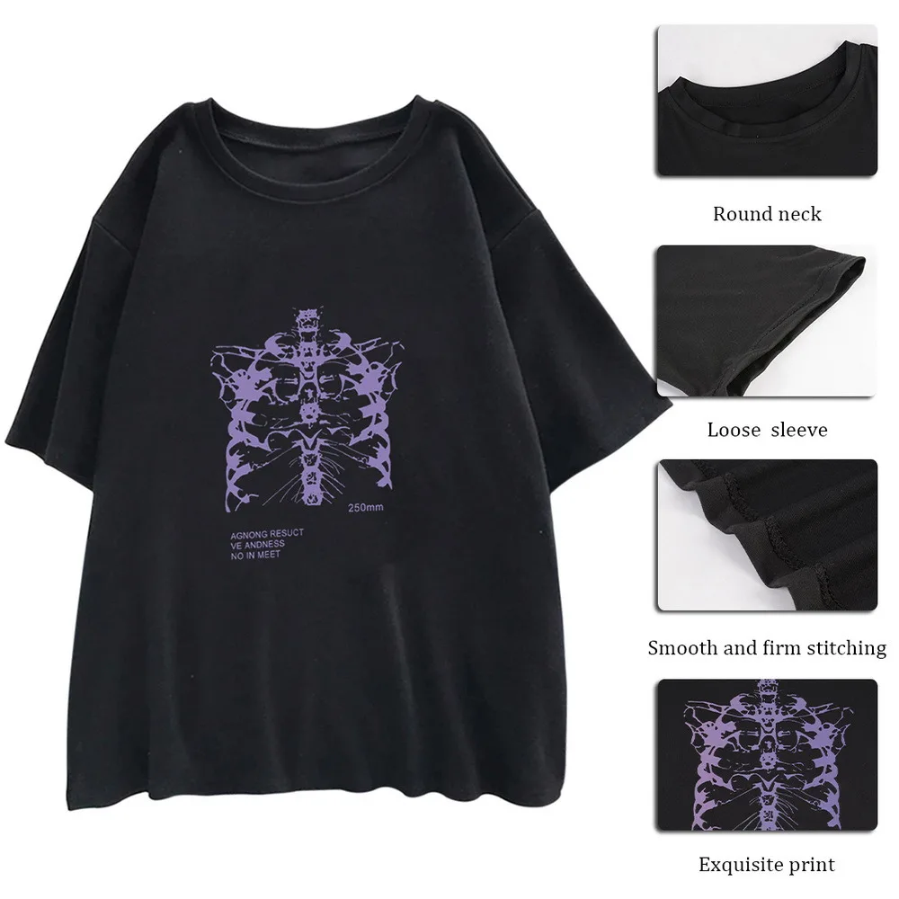 Женские футболки в готическом стиле с принтом скелета, летняя свободная футболка в стиле Харадзюку с коротким рукавом, базовая футболка, уличные Короткие топы большого размера