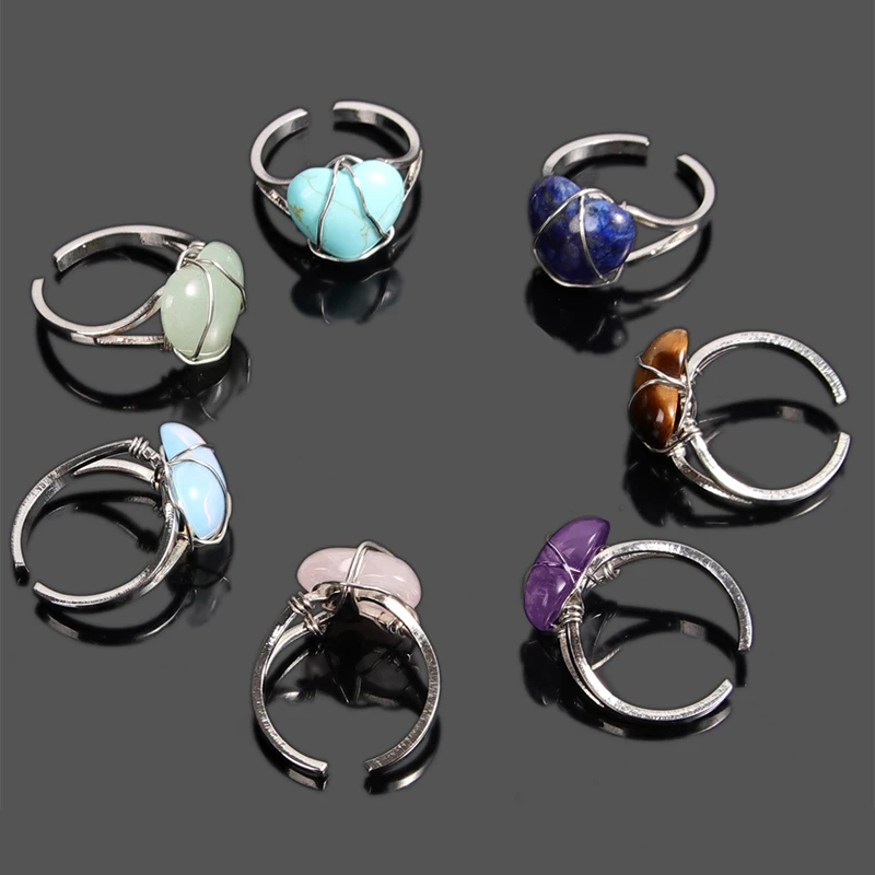 Регулируемые кольца из натурального кристалла в форме сердца, кварцевый камень, проволока, обмотка, парные индивидуальные аксессуары
