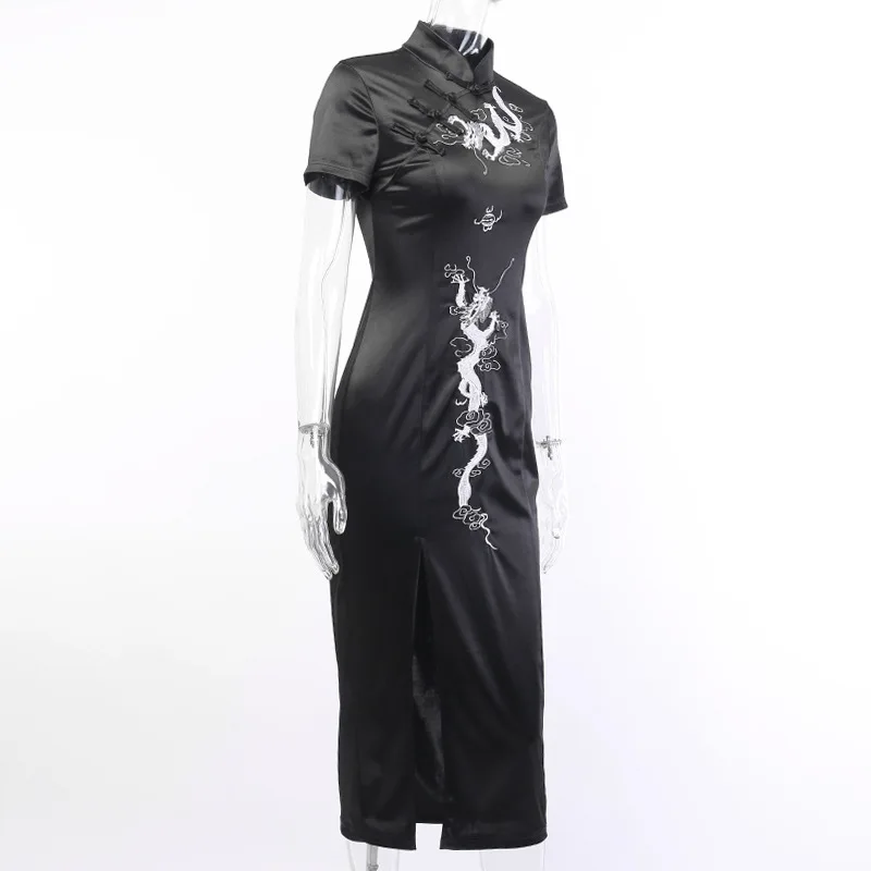 Женское винтажное платье чонсам, Черное длинное облегающее платье с вышивкой дракона, на пуговицах, лето-осень