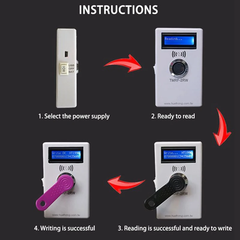 Он может копировать TM карту, товар TM1990A, DS1990/RW1990(DS1990A-F5,TM1990A-F5,DS1990R-F5)Он прост в эксплуатации, удобен и требуется всего три секунды для успешного копирования.Маленький размер, с пряжкой, легко носить с собой, использовать батареи (3 шт. * 7 батарей). Батарея в комплект не входитЭтот копировальный аппарат также поддерживает копию EM карты (ID карты) 125 кГц, например EM4100/TK4100Он может копировать EM4100 на 5200 или T5577 throug эту зону на картинке.Рабочее напряжение: положите аккумулятор или соедините с кабелем передачи данных с компьютером для питания (например: USB)Цвет: белыйМатериал: пластикПосылка:1 * RFID Копир10 * RW1990 ключ (по 2 для черного, красного, зеленого, синего и желтого)Только вышеуказанная посылка, другие товары не включены.Примечание: светильник и различные дисплеи могут привести к тому, что цвет товара на картинке немного отличается от реального. Допускается погрешность в измерениях +/- 1-3 см.