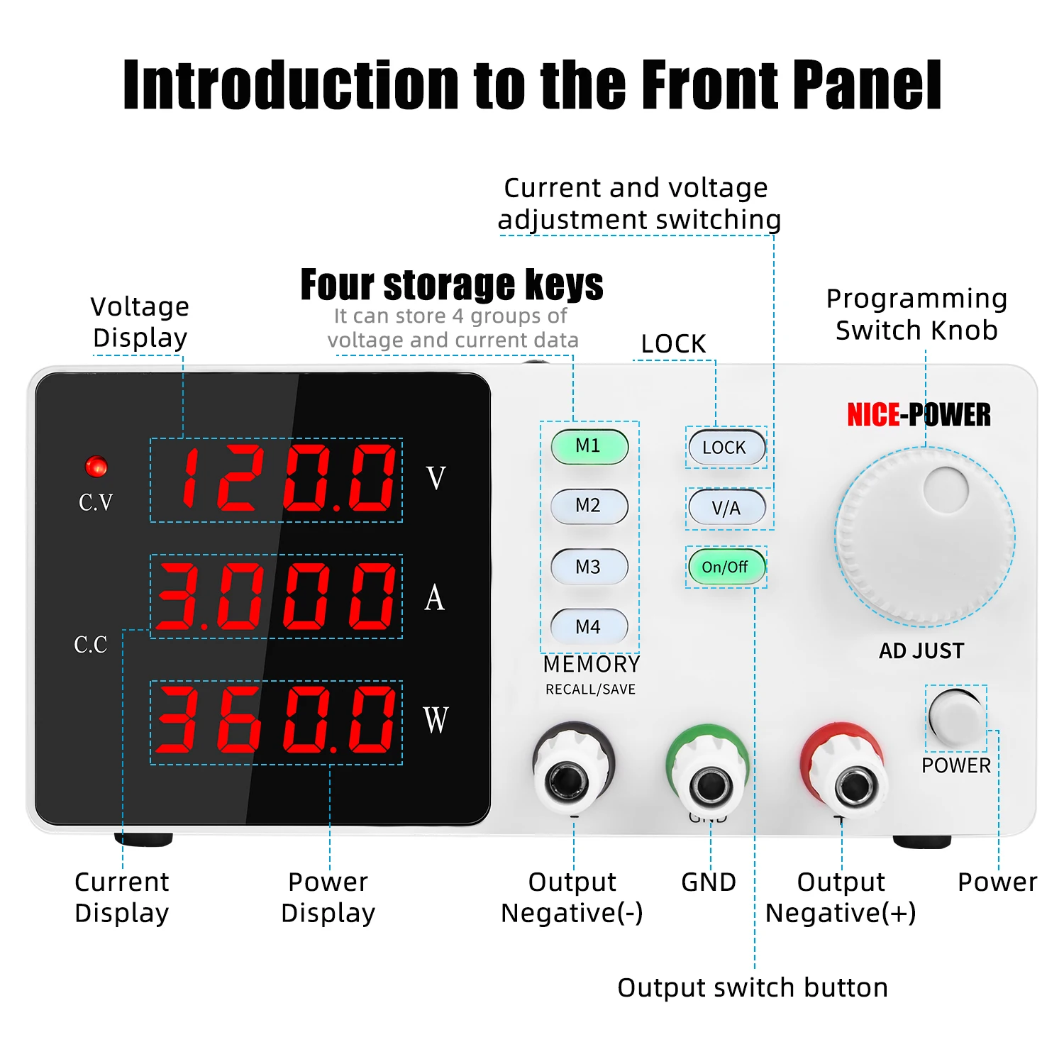 С функцией выключателя питания и кнопкой вывода тока, настольный источник питания хорошо подходит для лабораторий, школ, электрического обслуживания, DIY электроники, любительского, подходит для лабораторного и промышленного использования.