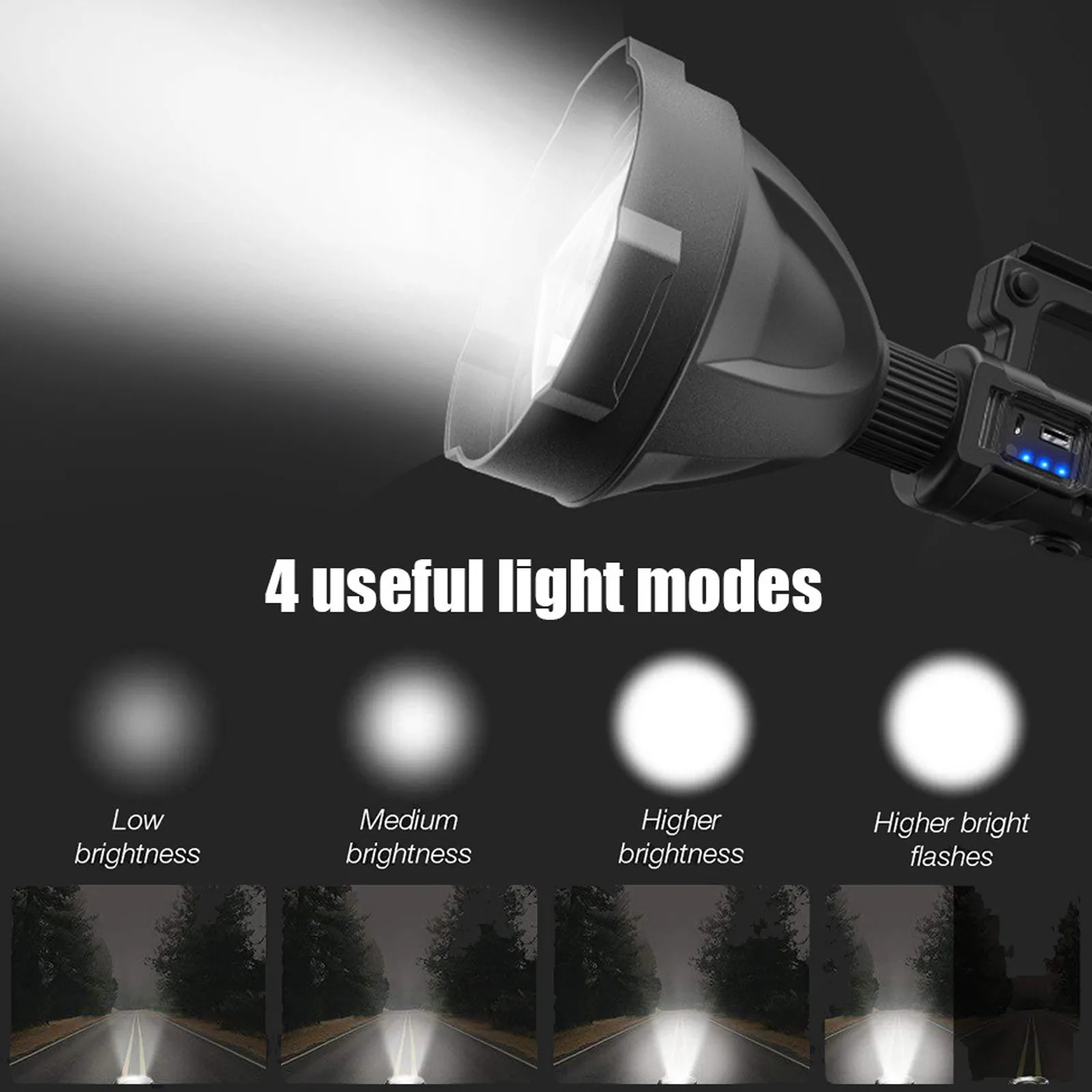 Многофункциональное и широкое применение-Супер яркие фары, большое расстояние освещения, большое расстояние, Поворотный и съемный. Легко носить с собой и может быть оснащен штативом, который очень подходит для активного отдыха в качестве прожектора, например, пеших прогулок, кемпинга, охоты, приключений, ночной рыбалки и т. д.
