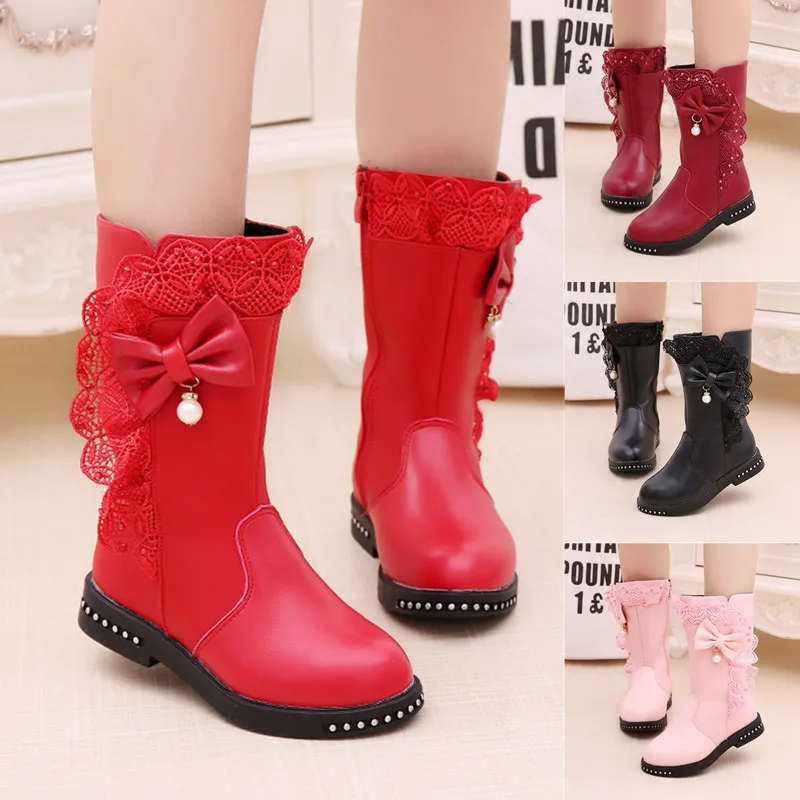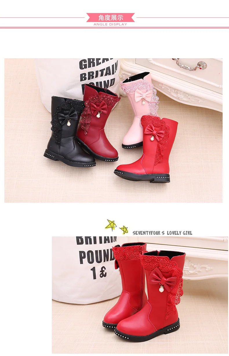 Сапоги для девочек, Осень-зима 2021, кожаные сапоги длиной до середины икры, детские сапоги с декором в виде банта на молнии сбоку, повседневные; Для прогулки