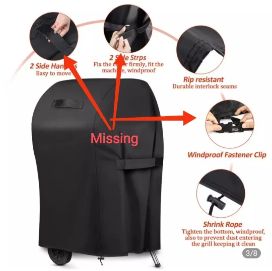 The product does not match the description, the only thing that matches is the size. No "side handels" No "side strips" No "windproof fastener clip" All photos are false. The cover that was sent to me costs half the other sellers.