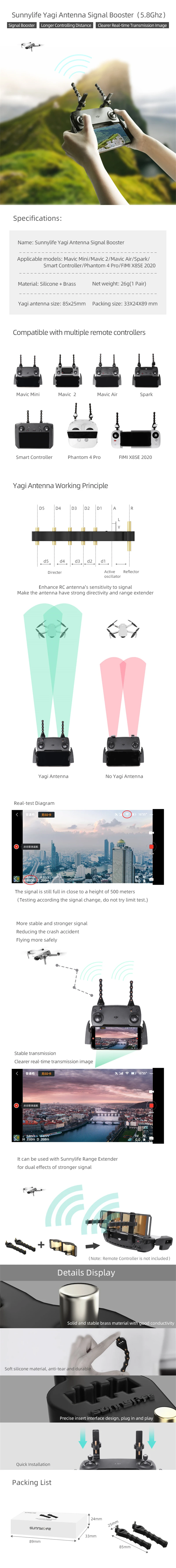 Особенности антенны Yagi:Антенный усилитель сигнала Sunnylife Yagi для Mavic Mini/ Mavic 2/Mavic Air/Spark/Smart Controller/Phantom 4 Pro/FIMI X8SE 2020Антенна Yagi может помочь получить более стабильный и более сильный сигнал и уменьшить аварию.Его можно использовать с расширителем диапазона Sunnylife для двойного эффекта более сильного сигнала.Спецификация: 2 антенны YagiОсобенности расширителя диапазона:Подходит для SPARK, MAVIC PRO, MAVIC AIR, Mavic Mini, Mavic 2 PRO и Mavic 2 ZoomИспользуются импортные зеркальные алюминиевые листы, высокий коэффициент отражения 95% с более сильным сигналомТехнология прессформы, точная обработка, простота установкиПолностью приклейте алюминиевый лист к корпусу, не отваливаетсяСкладной, удобно носить с собой