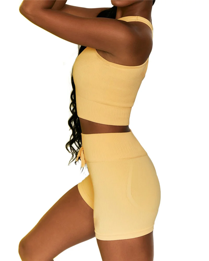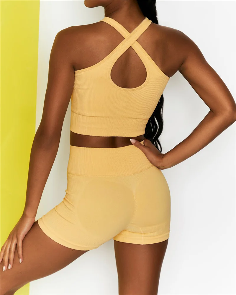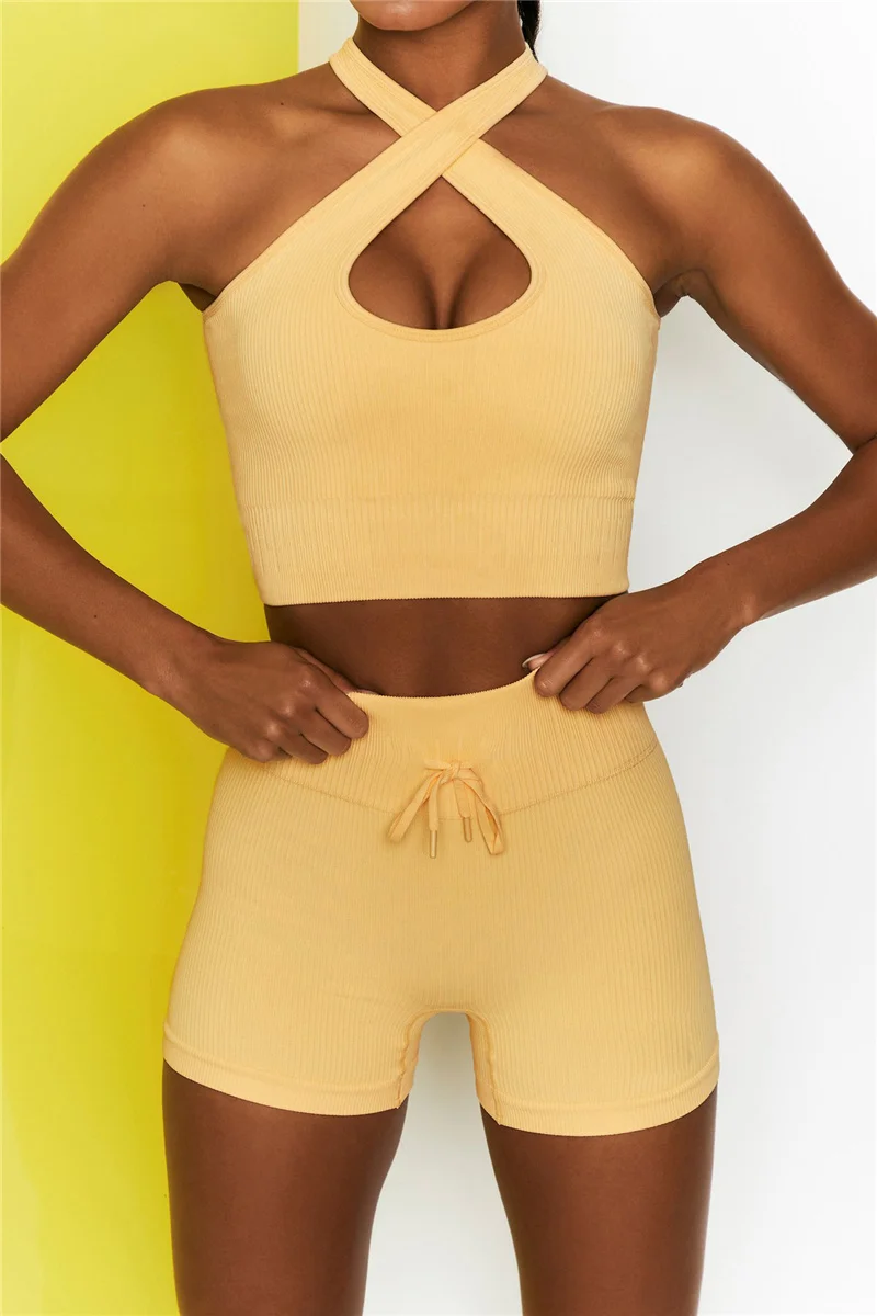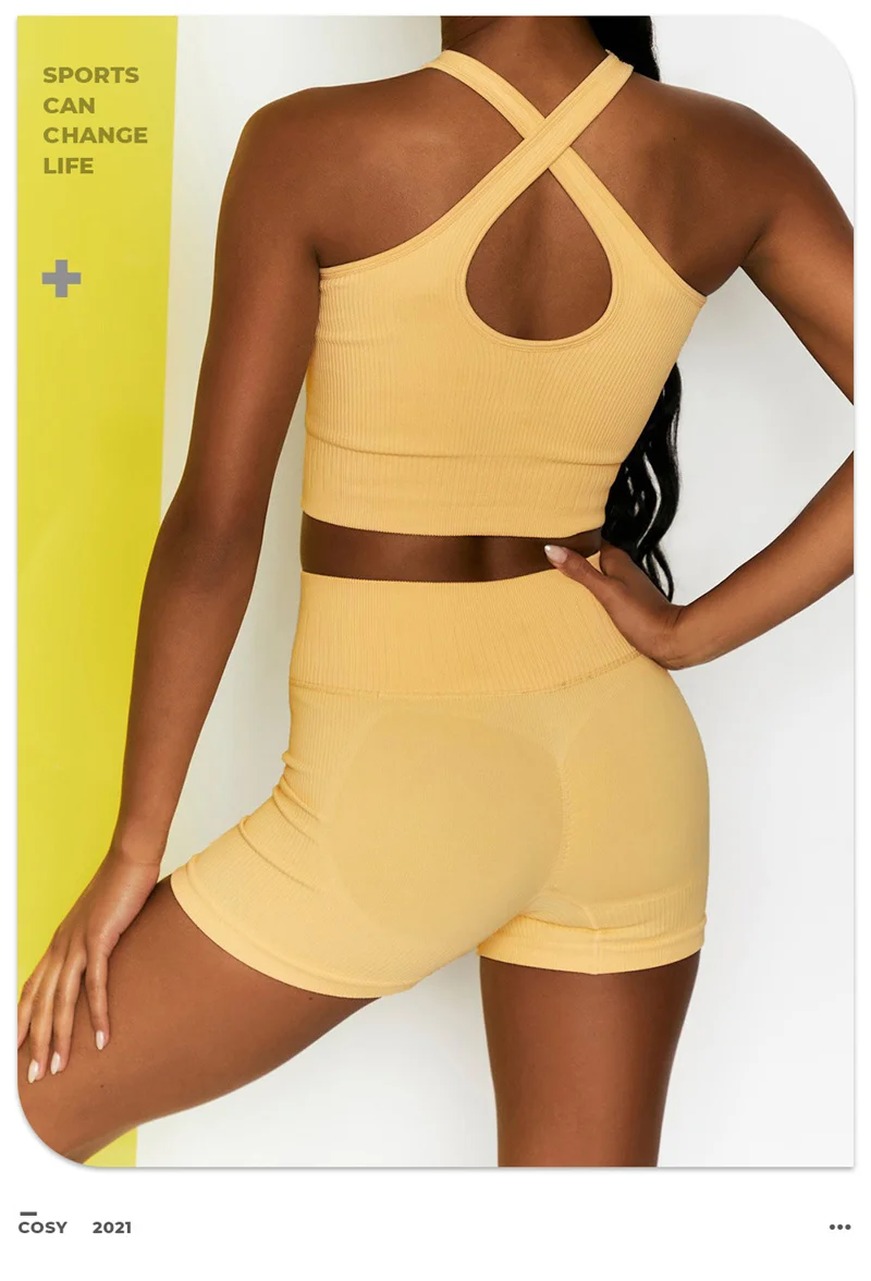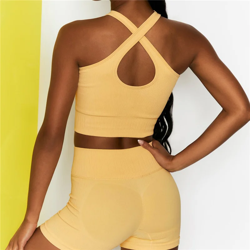 Сексуальный бесшовный спортивный комплект для женщин из 2 предметов, укороченный топ, бюстгальтер, шорты, спортивный костюм для йоги, тренировочный наряд, одежда для фитнеса и спортзала