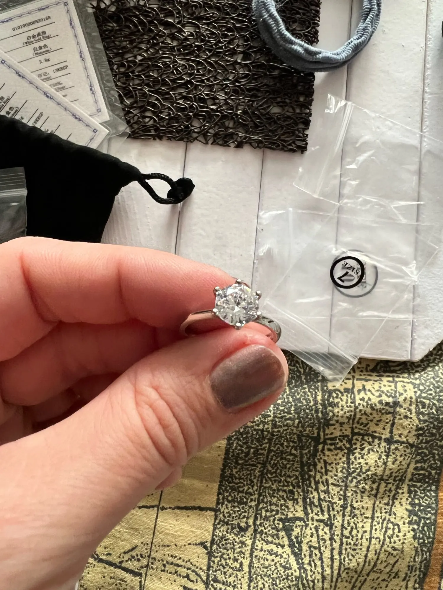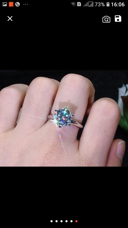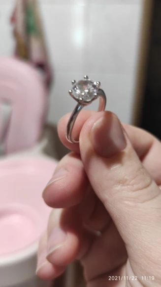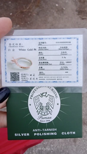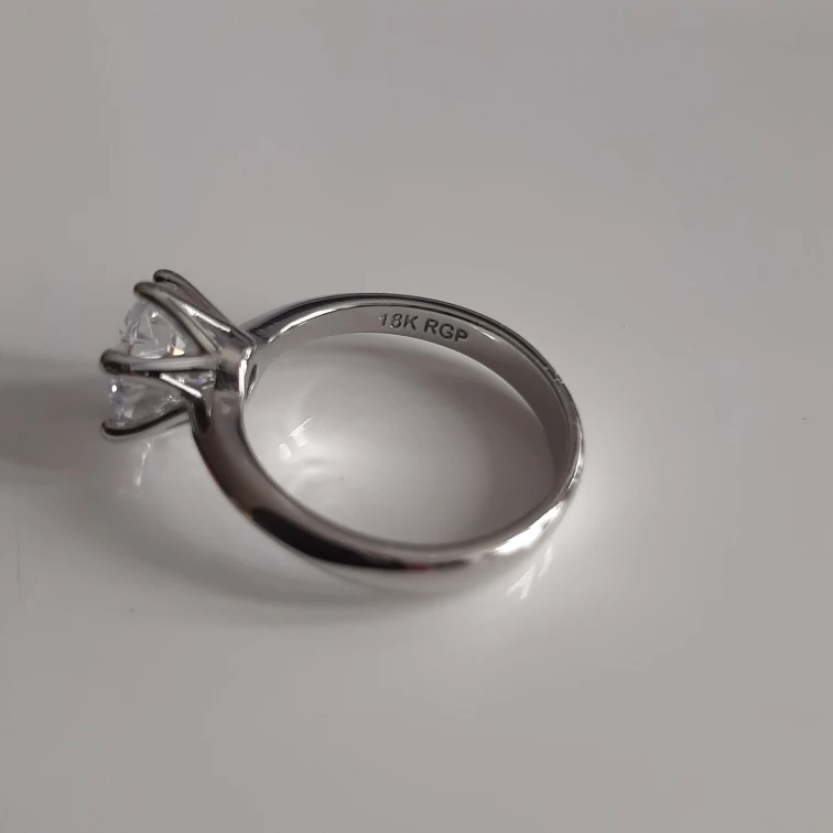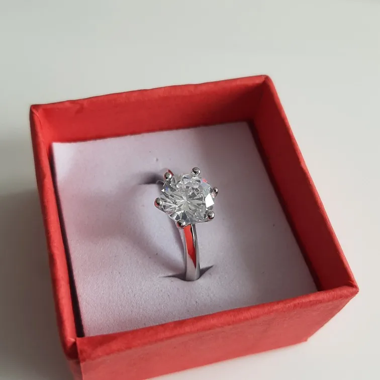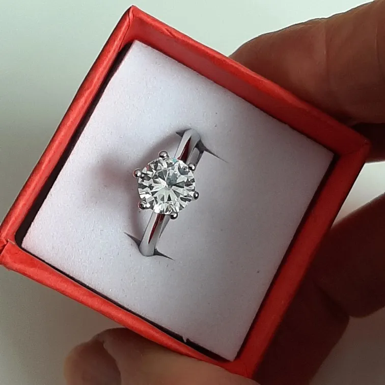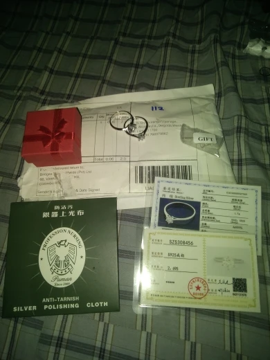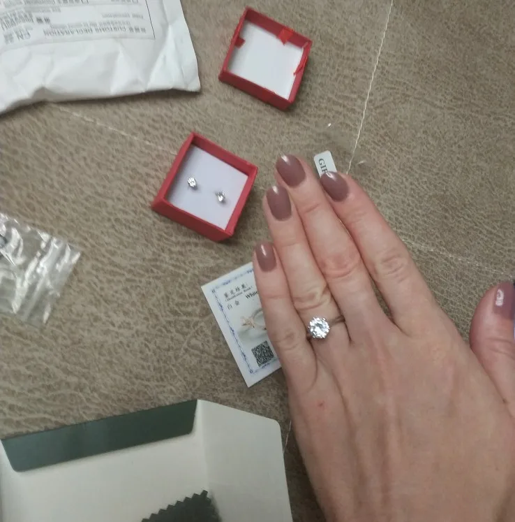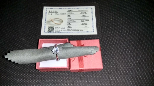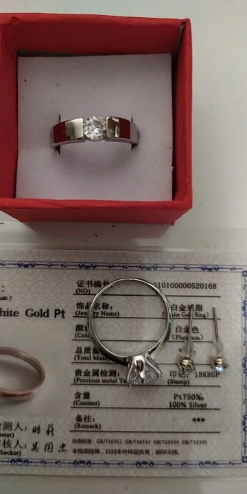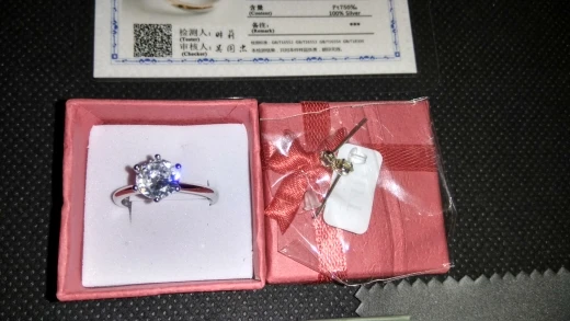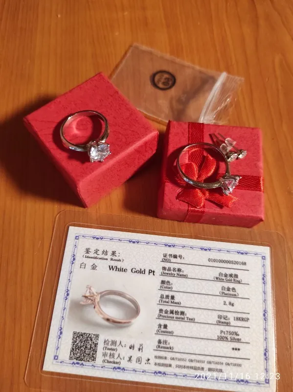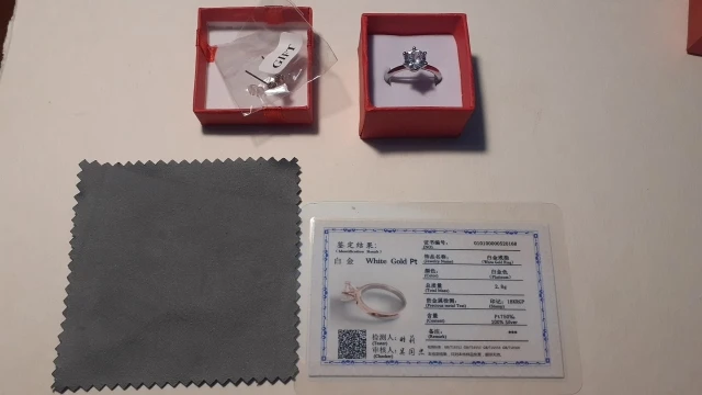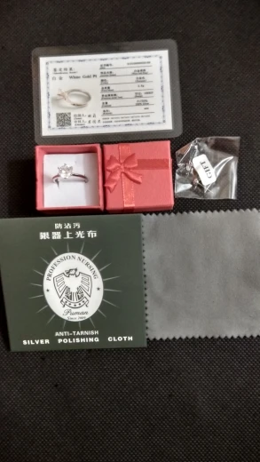 Кольцо внешне выглядит как заявленное. Есть сертификат на английском и китайском, что 100% серебро, 18 карат. У меня цвет кольца серебристый, а в сертификате изображен золотистый и написано, что цвет платины. Проба стоит только 18 карат. Камень очень крупный, что вызывает подозрение о бижутерии, как и сама стоимость. Пришло с подарочной упаковкой и салфеткой. В подарок положили крохотные гвоздики с прозрачным камнем.
