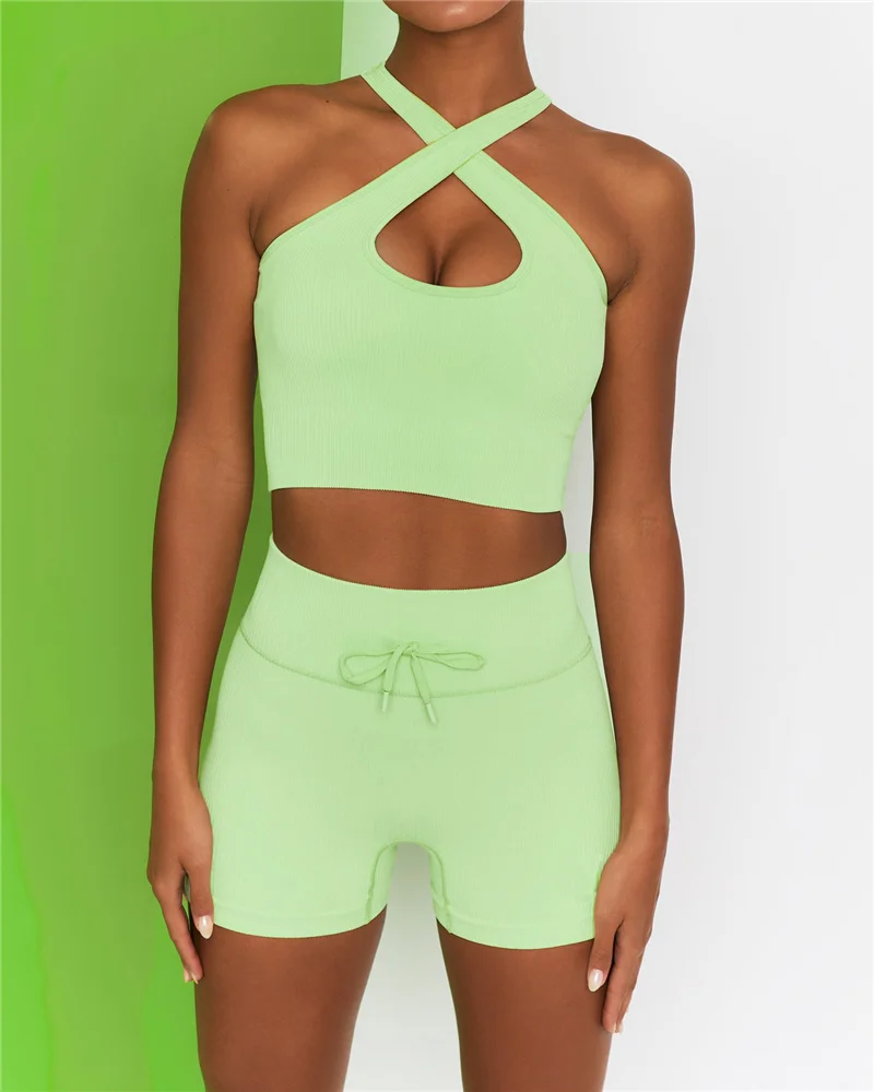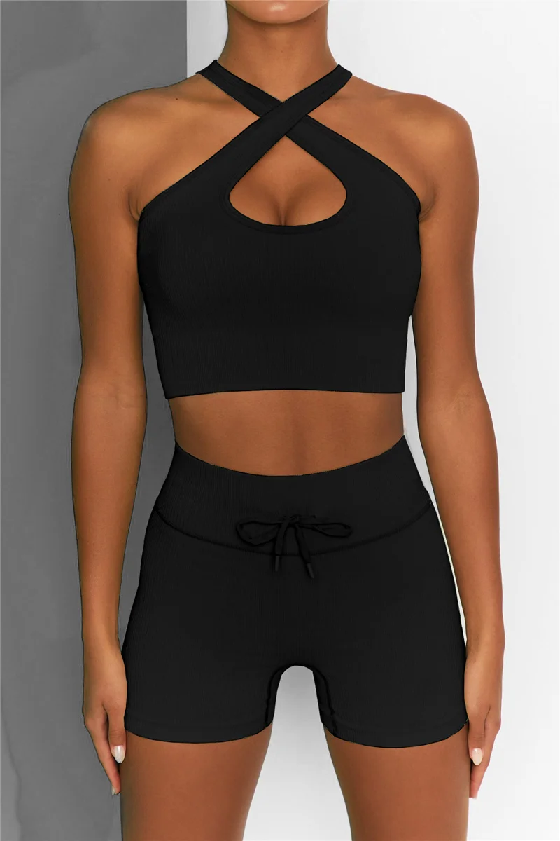 Бесшовный спортивный комплект из двух предметов для женщин, укороченный топ, бюстгальтер, шорты, тренировочный наряд, одежда для фитнеса, сексуальный костюм для спортзала, женские комплекты для йоги, одежда