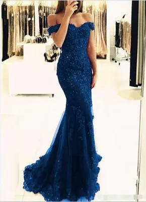 Длинное платье с открытыми плечами, вечернее кружевное платье-русал...