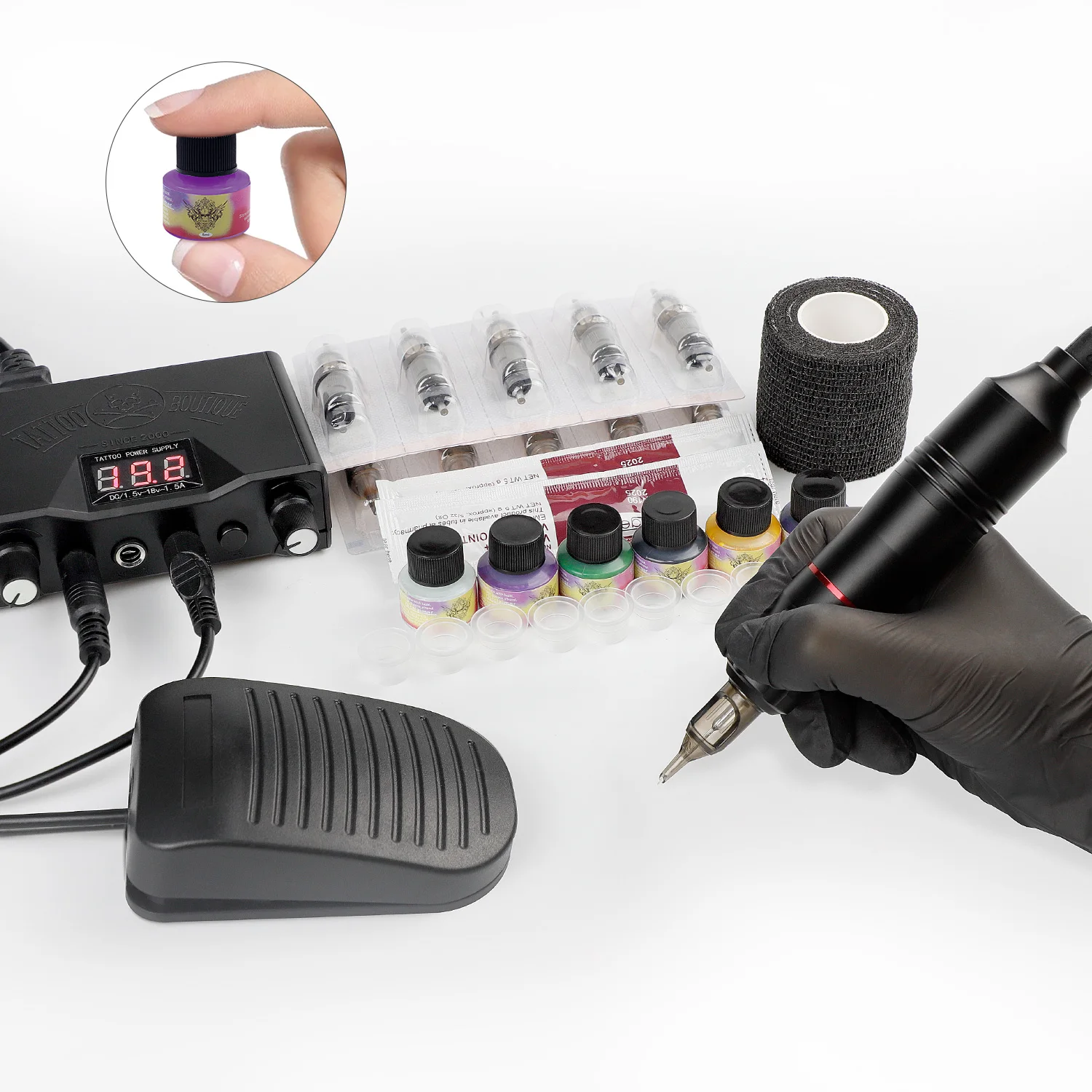 1 тату-ручкаБлок питания для татуировки, 1 шт.Педаль 1 штСоединительная линия 1 шт.1 пара перчаток1 шт. бандажная лентаВитаминная мазь 2 шт6 шт 5 мл чернил для татуировки20 игл для татуировкиЧернильный стакан 10 шт.1 шт. коробкаСовет: чернила для тату предназначены только для практики, 5 мл/флакон. Желтый, синий, фиолетовый, черный, белый и зеленый