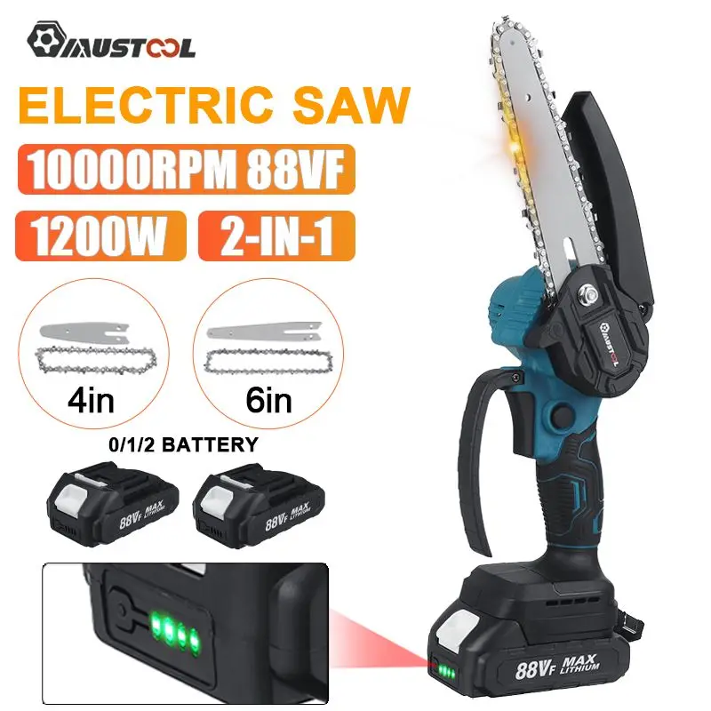 Характеристики:Название: Электрическая цепная пила 4 и 6 дюймовВилка (опция): вилка стандарта США/ЕСБатарея: 88VF1 * Емкость аккумулятора: 9000 мАч2 * Емкость аккумулятора: 2*9000 мАчВыходная мощность: 1200 ВтСкорость без нагрузки: 10000 об/минРежим питания: литиевая батареяЦвет: синий