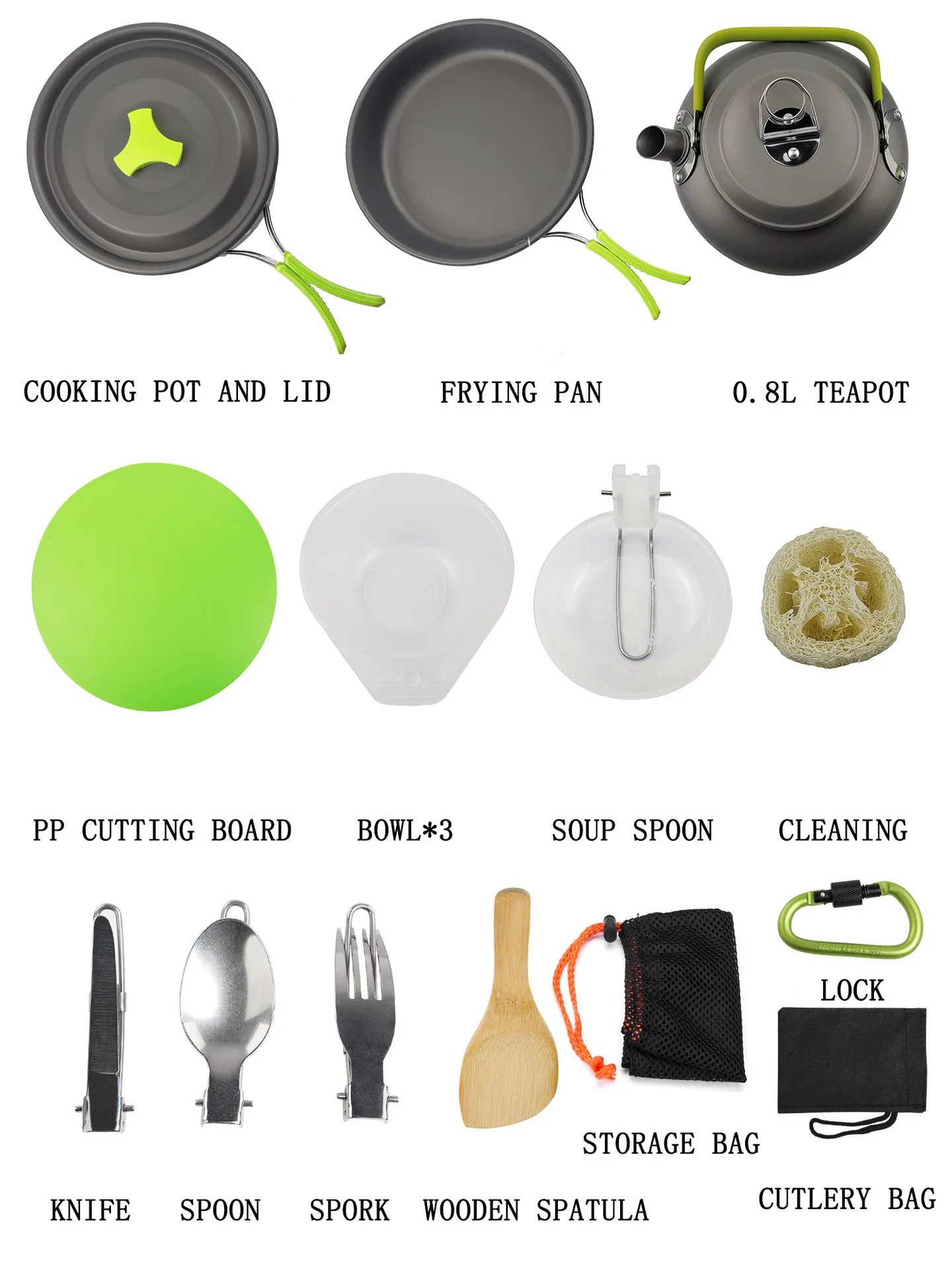 Подходит для 2-3 человек, включая большой горшок, сковородку, чайник, три маленькие миски, ложку, деревянный шпатель, вилку, ложку, нож, замок и разделочная доска. Набор посуды изготовлен из алюминиевого сплава, который прошел передовую жесткую обработку, которая устойчива к высоким температурам и трению. Столовые приборы изготовлены из нержавеющей стали. Используйте высококачественную ПП для разделочной доски