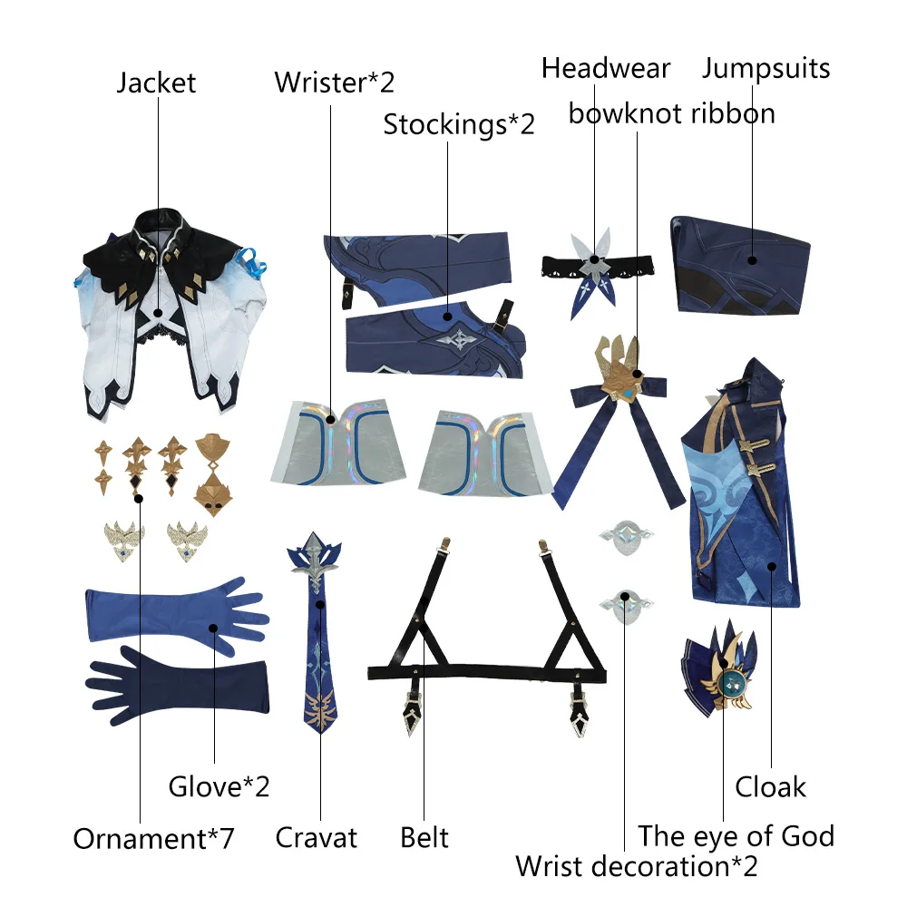 Посылка включает в себя полный комплект: Куртка, комбинезон, плащ, чулки * 2, wrister * 2, головной убор, бант, лента, орнамент * 7, перчатки * 2, галстук, пояс, украшение на запястье * 2, глаз Божий