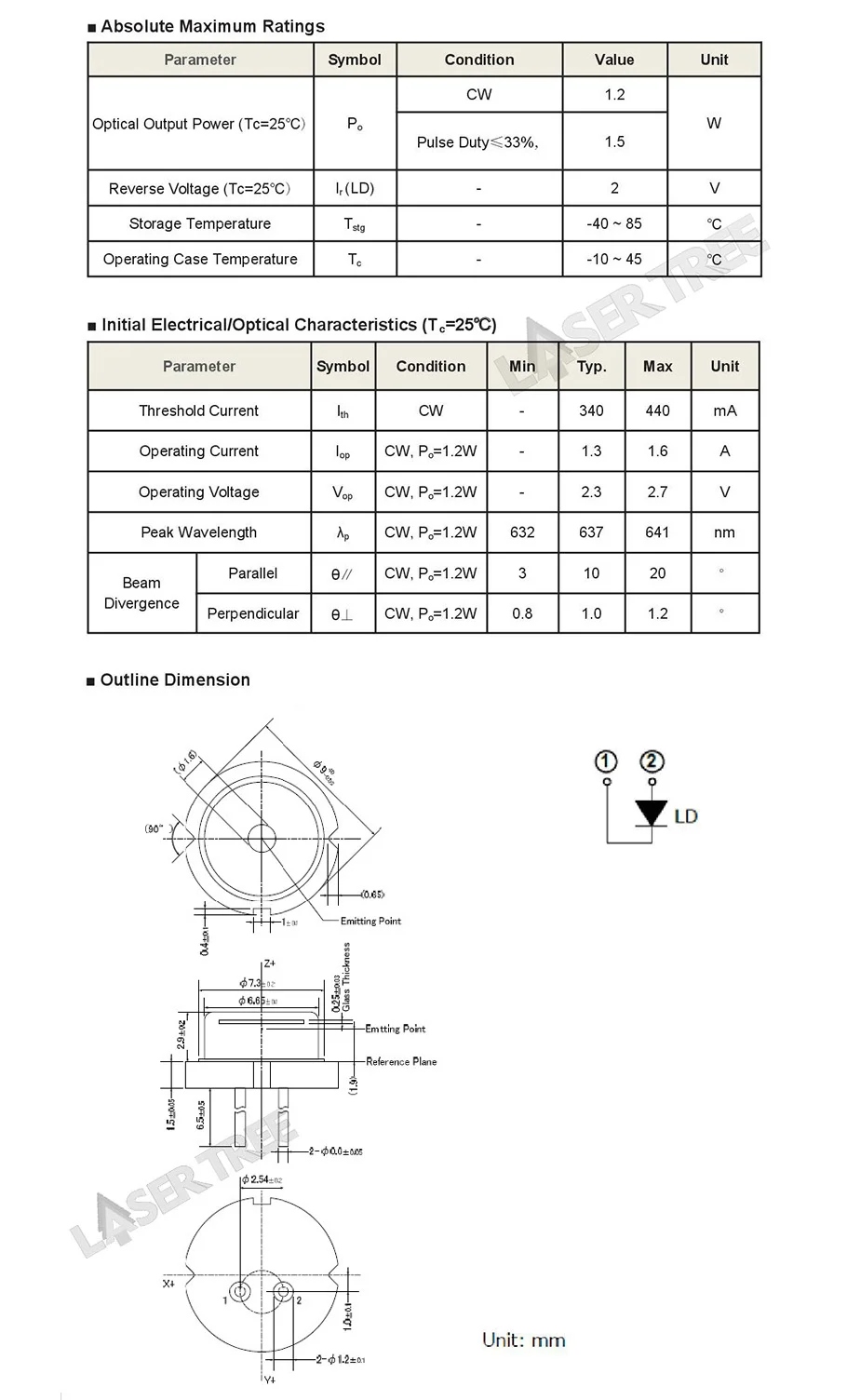 Лазерный диод высокой мощности, 638 нм, 1,2 Вт, с технологией сжатого точечного луча
