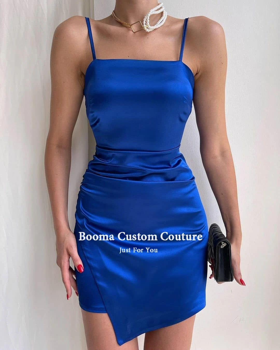 Коктейльные платья Booma из атласа Королевского синего цвета, Клубное платье мини на тонких бретелях, сексуальные платья для вечеринок с рюшами, 2021