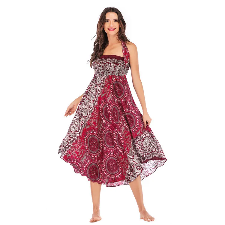 Женская длинная юбка в стиле бохо, свободная юбка с цветочным принтом и лямкой на шее, в богемном стиле