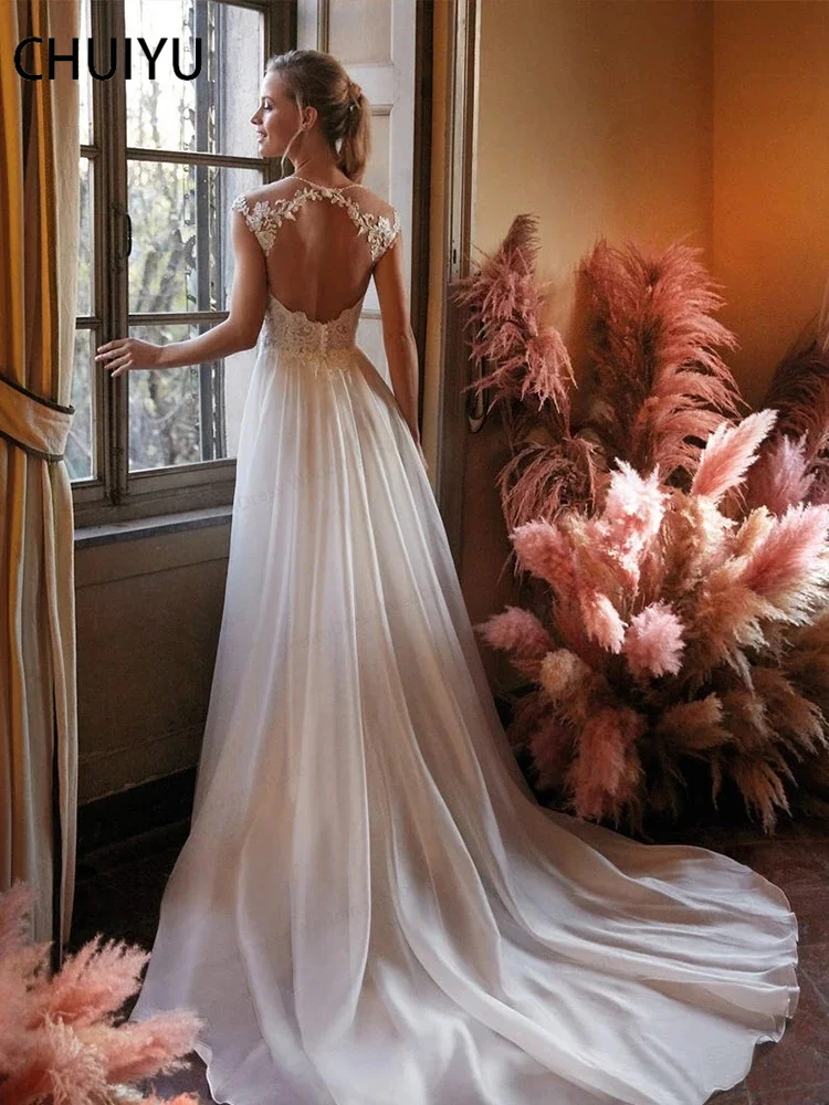 Шифоновые длинные свадебные платья-трапеции с открытой спиной и V-о...