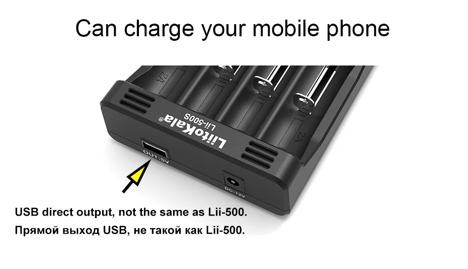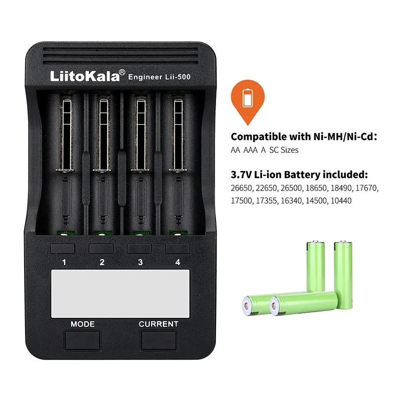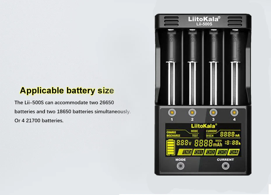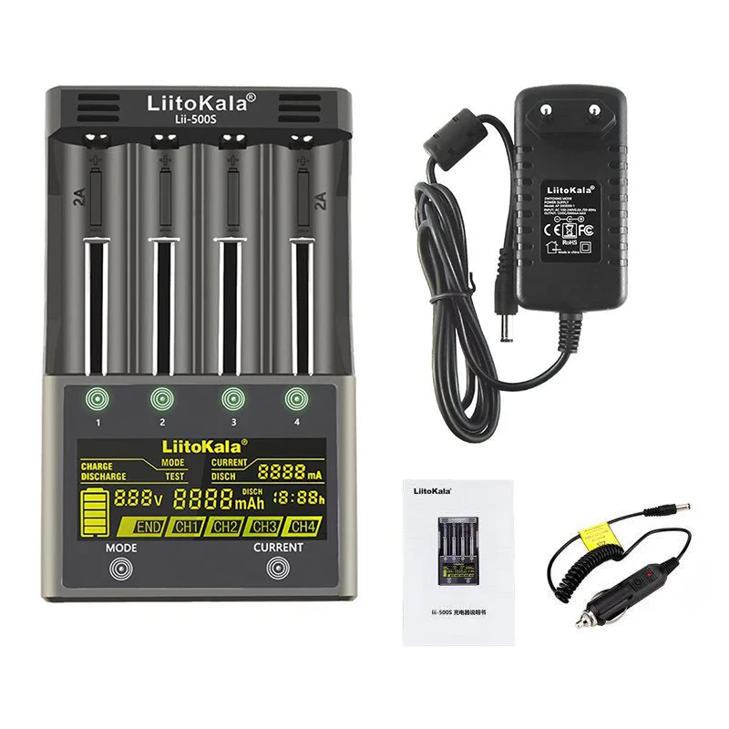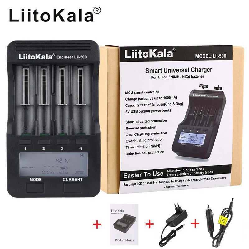 Конкретные параметры:1. Входное напряжение постоянного тока: 12 В/2.0A2. Зарядный ток литий-ионного аккумулятора: 4,2 V 300mA / 500mA / 700mA / 1000mA3. NiMH аккумулятор зарядный ток: 1,48 на 300mA / 500mA / 700mA / 1000mA4. Характеристики аккумуляторной батареи: 18650,26650, 14500, AA, AAA и другие.5. Ток разряда: 250 мА, 500 мА6. Выход USB: 5 В --- 1000 мА7. Завершение: Интеллектуальный контроль напряжения8. Размер: 162 мм (длина) * 96 мм (ширина) * 36 мм (высота).Характеристики:1.4 вида Регулятора Тока зарядки (mA / 500mA / 700mA / 1000mA);2. Различные спецификации (18650/26650... / AA / AAA) в зарядное устройство;3. Зарядное устройство устраняет использование отдельного ЖК-экрана, напряжения (V) тока (MA) время (H) Емкость (mAh) сопротивление (MR) опции, E... Обзор;4. В режиме зарядки 4 канала работают независимо, вы можете выбрать другой зарядный ток для зарядки и литий-ионных аккумуляторов hunchong и никель-металл-гидридных батарей.5. В режиме быстрого тестирования 4 канала могут быстро обнаруживать емкость батареи, независимо от литий-ионных батарей и никель-водородных батарей, работают независимо. Быстрый процесс обнаружения емкости аккумулятора (1 категория, 2 полных) два шага6. Ни в тестовом режиме, емкость батареи, как правило, находится три шага процесса (1 сначала заряжен, затем разряжен 2 и 3 пополнения), процесс обнаружения емкости батареи;7. Зарядка и быстрый тест/без теста 3 режима могут работать одновременно; Независимая Возможность зарядки/быстрого обнаружения/нормальная емкость обнаружения;8. Различные функции защиты: перегрузка и перегрузка, короткое замыкание, температура, напряжение функции 0V активированы, (& Delta; V и 0 & Delta; V), 1,65 B 2,2 B нельзя заряжать, Интеллектуальное распознавание плохой батареи и защита от обнаружения обратной батареи.9. Со стандартным выходом USB 5 В/1000 мА: 1-4 литиевые батареи, литиевые батареи, выход USB, продукт не может быть никель-металл гидридный аккумулятор с выходом USB.10. Со специальным адаптером питания: входное напряжение постоянного тока: 12 В/2 А.Описание ключей:1. Зарядное устройство имеет шесть кнопок, ключевой режим (режим), текущий выбор ключа (NAP) и просмотр данных независимо от выбранного ключа (1234), использование простого и удобного;2. Удерживайте клавишу Mode в любом чехол, и в течение 3 секунд, чтобы изменить режим (бесплатно) или быстрый тест без тестирования (тест емкости), затем нажмите снова соответствующие функциональные клавиши могут быть изменены в течение 8 секунд, ток, независимый, Hunchong, тест емкости, Выбранная функция через 8 секунд в рабочем состоянии, в рабочем состоянии может нажать (1234) для просмотра тока (MA) /емкости (mAh) /напряжения (V) /времени (H) /Информация о сопротивлении (MR).Упаковочный лист:1 * зарядное устройство LiitoKala Lii-500 (без аккумулятора)Адаптер 1*12V 21 * Автомобильное зарядное устройство1 * Руководство пользователя1 * упаковочная коробка