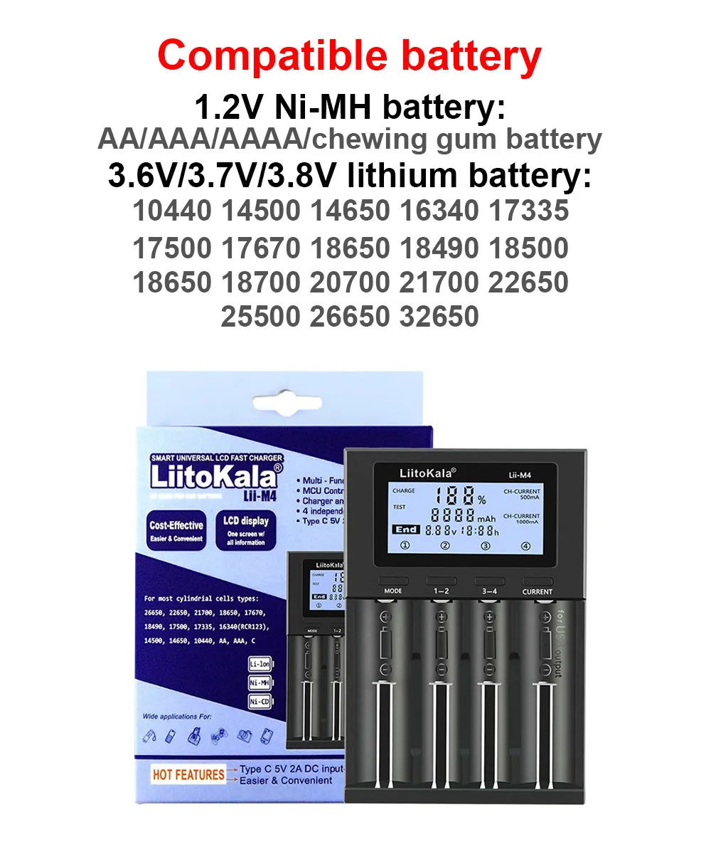 Предостережения:1.Thischarger can chargeallcylindricalrechargeablebatteries 3.7VLi-Ion, 3,8 VIMR,1.2VNi-MH/Cd, 3.2VLiFePO42. Прочитайте это руководство перед использованием И обратите особое внимание на рекомендуемый ток заряда, не нужно заряжать аккумулятор за рекомендуемый лимит тока3. Если вход постоянного тока, рекомендуется only12V1Ais4. Нагрев во время зарядки5. Извлеките зарядное устройство из источника питания после завершения зарядки и одновременно извлеките аккумулятор из зарядного устройства6. Только для использования в помещении7. Отображение данных только для справки, пожалуйста, обратитесь к профессиональному инструменту для получения более точных данныхХарактеристики и функции:1. Мульти-вход питания: кабель переменного тока 110-240V 50/60Hz (все указанные аккумуляторы входят в комплект поставки)/ 12V 1A адаптер (выборочно), четыре независимых зарядных разъем) и микро компьютерная система управления.2. Зарядный ток, интеллигентая (ый) Авто-набор всего три уровня: 500mA/1000мА/2000mA),2000mA фиксируется только для слот #4.3. Многофункциональный дисплей: forcharging progress25 % - 50% - 75% -100%, типы батарей: ni-mh 1,2 V, Li-Fe 3,2 V, Li-ion 3,7 V, Li-ion 3,80 V(IMR), емкость зарядки, напряжение и ток: 0.5A/1A/2A.4. Автоматическое определение литий-ионных и никель-гидридных аккумуляторов и Ручная настройка режима зарядки для литий-ионных батарей LiFePO4 и 3,80 в (IMR)5. Обновите для OV батареи. Не будет заряжать аккумулятор 1,65-2,20 в (обновленный ток может быть обнаружен только)6. Многофункциональная функция защиты от перезарядки и переразряда, короткого замыкания, полярности и т. д. Он может точно определить сломанные батареи с гораздо большей безопасностью.7. Зарядка при постоянном напряжении и токеКнопка и ЖК-дисплей:1. Режим Buttonof (кнопка канала): Есть 4 независимых кнопки отдельно для каждого канала. Whilepower supplyis подключается и батарея вставляется, 1) короткий clickthechannelbuttonin 5Sto изменить тип батареи. Он начнет зарядку через 5 секунд после того, как установка типа аккумулятора (3,2 V или 3,80 V), 1,2 никель-металл-гидридный аккумулятор с напряжением и 3,7 V литий-ионный аккумулятор может быть обнаружена автоматически, поэтому потребуется установка только в том случае, 3,2 V и 3,8 V батареи;Примечание: тип батареи может быть выбран только перед запуском зарядки.2. ЖК-дисплей: при подключении к источнику питания, ЖК-дисплей будет включаться 3S:1) Если аккумулятор не вставлен, ЖК-дисплей будет отображать «null» и будет выключен в 30S2), когда батарея вставлена и обнаружена, В ЖК-дисплей покажет номер канала, в то время как батарея изображения типа "li-ion 3,7 с v-образной горловиной и flashingindicatingto Тип батареи: Этот momentifshort нажмите кнопка канала, он может установить тип батареи; Если нет operationin5 секунд Это beginsbyautomaticdetection (литий-ионный аккумулятор 3,7 V или никель-металл-гидридного) thencharging процент изображение будет мигать определение начала зарядки. В то же время ЖК-дисплей также заряжает напряжение, емкость, время и ток. Когда зарядка завершается, она будет отображать «100%», в то время как она показывает «Конец» на ЖК-дисплее в правом нижнем углу.