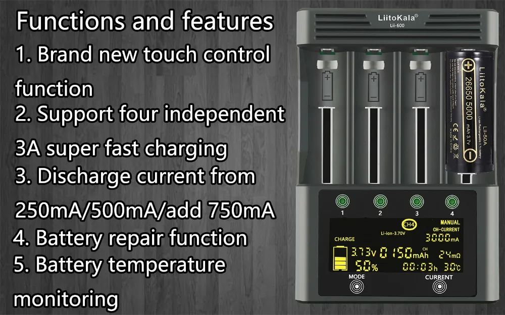 Конкретные параметры входного напряжения: 12 В/5A постоянного токаВыход напряжение: DC 4,2 V / DC 1,48 VЛитиевая батарея выходного токаТок зарядки: (250мА/500мА/1000мА/1500ма/2000ма/3000ма) * 4 NiMH батареиТок зарядки: (250мА/500мА/1000мА) * 4 ток разряда: 250мА/500мА/750маХарактеристики аккумуляторной батареи: 26650,21700,18650,18350, 20650,14500, AA, AAA и т. Д.Метод прерывания: Интеллектуальный контроль напряжения Размеры: 165 мм (длина) * 115 мм (ширина) * 40 мм (высота).Функциональные характеристики1. Новая функция сенсорного управления;2. Четыре слота работают независимо;3. Он имеет два режима работы: автоматический и ручной; (по умолчанию система является авто, автоматически распределяет ток)4. Различные дополнительные зарядный ток: 250 мА/500/1000 мА/1500 мА/2000/2500 3000 мА/;5. Ток разрядки третьего этапа: 250мА/500мА/750ма;6. Различные характеристики (18650/26650... /AA/AAA) Зарядка аккумулятора одновременно;7. Используйте отдельный ЖК-дисплей для этого продукта. Содержит тип батареи (Li - ion-3,7 V, Ni - MH1.2 V), работа (Автоматическое/ручное руководство), канал батареи (CH1 - CH4), режим работы (зарядка/разрядка моделей разряда/проверка тестирования/режим ремонта), емкость заряда и разряда (мА · ч), время зарядки и разряда (ч), ток заряда и разряда (MA), напряжение батареи (V), процент батареи %, внутреннее сопротивление батареи (m Ω) ℃, температура и другие параметры, детальный и четкий;8. В режиме зарядки 4 канала работают независимо, и каждый канал может выбрать различный зарядный ток и емкость для тестирования;9. В режиме разрядки четыре канала работают независимо, и каждый канал может выбрать различный ток разряда и определить емкость разряда;10. Режим тестирования: нормальный процесс тестирования емкости аккумулятора состоит из трех шагов (1 Зарядка, 2 разряда и 3 перезарядки) для тестирования процесса емкости аккумулятора;11. Различные каналы могут работать с различными режимами (зарядка, разрядка, тест и ремонт); Независимо от установки зарядки/разрядки тестирования Емкости/нормальной мощности тестирования функций;12. Множественная функция защиты: разрядка перезаряда, короткое замыкание, функция температуры и активации, напряжение 0 В (- Δ в и 0 В), 1,65 в до 2,2 в не может заряжать функцию, интеллектуальное распознавание и Защита аккумулятора от обратного подключения.