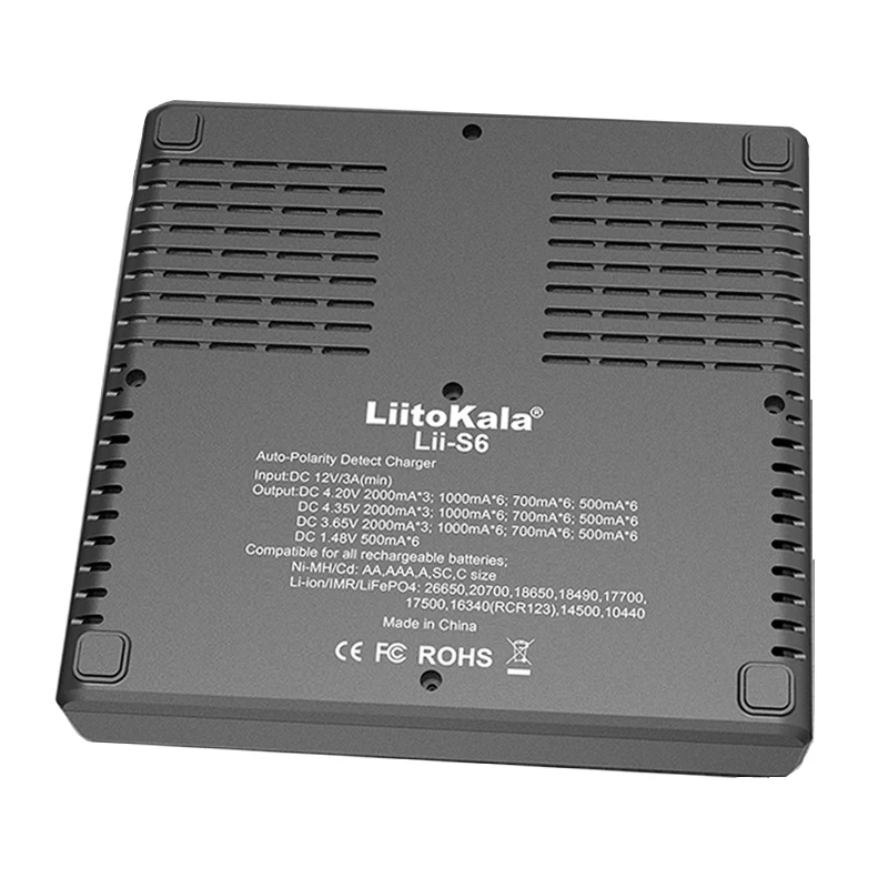 * Автоматическое определение полярности.* 12 В/3 А вход с общей мощностью 36 Вт.* 6 слотов работают независимо. Он может быть заряженВместе с различными аккумуляторами.* Может вместить 32700, 26650, 21700, 20700,Ni-mh SC и другие большие батареи* Различные защиты, безопасная зарядка.ПараметрыВход: 12 В/3 А постоянного тока (мин)Выход: DC 4,20 V 2000mA * 3; 1000mA * 6;700мА * 6; 500мА * 6DC 4,35 V 2000mA * 3; 1000mA * 6;700мА * 6; 500мА * 6DC 3,65 V 2000mA * 3; 1000mA * 6;700мА * 6; 500мА * 6DC 1,48 V 500mA * 6Совместим со всеми перезаряжаемыми батареями;Ni-MH/Cd: AA,AAA,A,SC,C РазмерLi-ion/IMR/LiFePO4:26650,20700,18650,18490,17700,17500,16340(RCR123),14500,10440Автоматическое определение полярностиLii-S6 автоматического определения полярности не нужно различать положительную или отрицательную полярность аккумулятора. Просто положите аккумулятор в зарядное устройство.